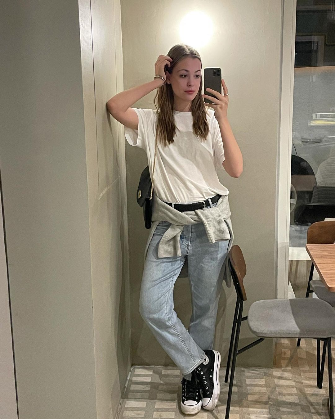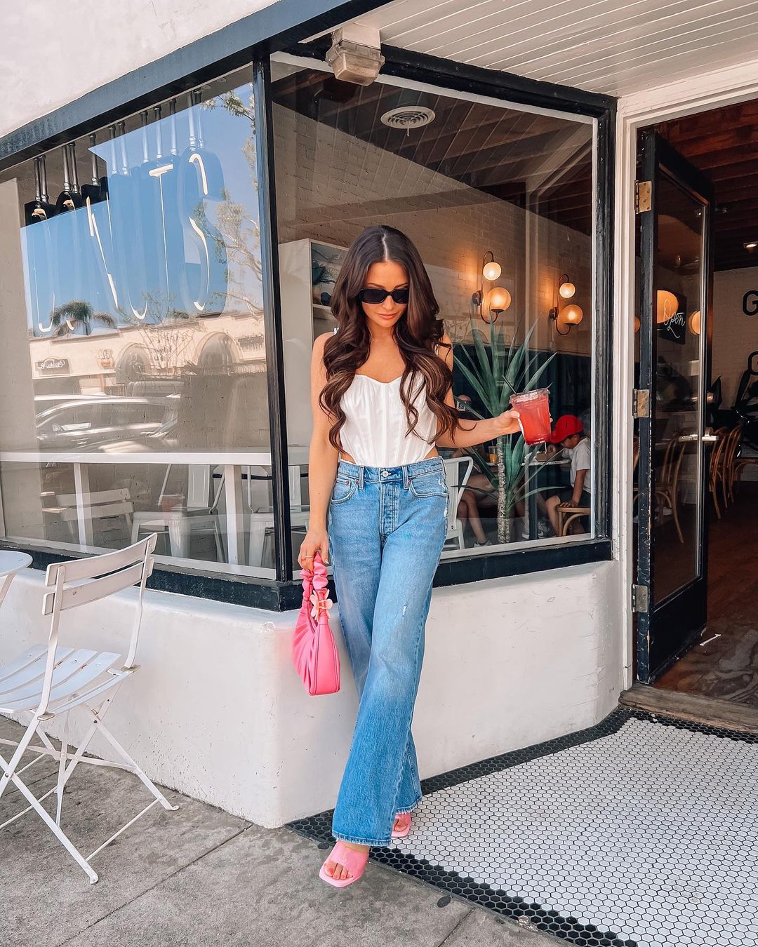 Сочетание низкой посадки и кроп-топа – одно из самых стильных решений этой весной и летом. Чтобы сбалансировать образ, сверху можно накинуть пиджак, удлиненный бомбер, кожаную куртку или тренч, в зависимости от погодных условий. Также джинсы можно сочетать с рубашками навыпуск, объемными футболками, майками и корсетами. Попробуйте составить образ total denim, когда и верх и, низ у вас из джинсовой ткани, выйдет очень интересно. Еще, чтобы добавить перчинки в образ можно наверх надеть топ в бельевом стиле и добавить пиджак. Модным аксессуаром, который украсит вашу талию, станет цепочка на живот, что тоже сейчас набирает популярность. В качестве обуви подойдут кроссовки, лодочки, босоножки на каблуке и сандалии.
