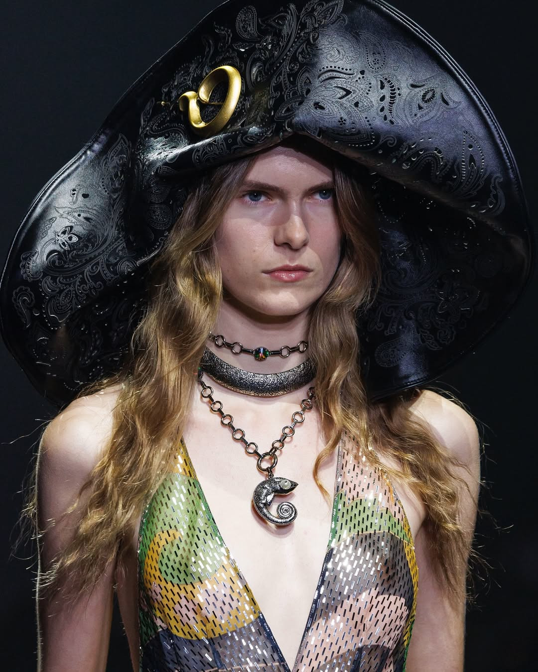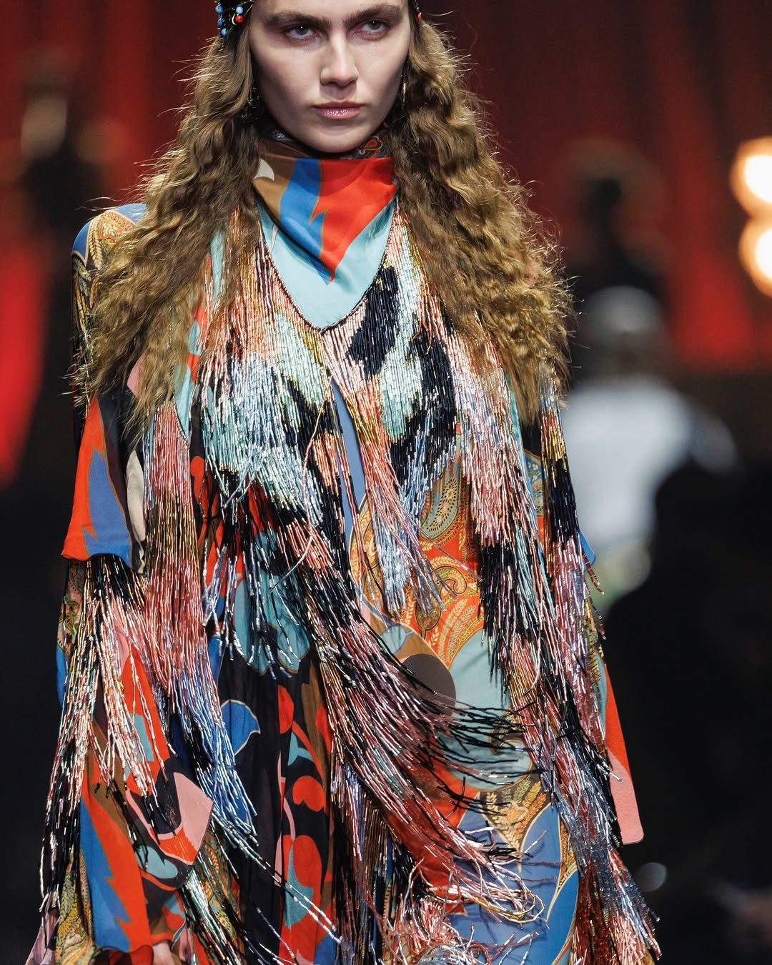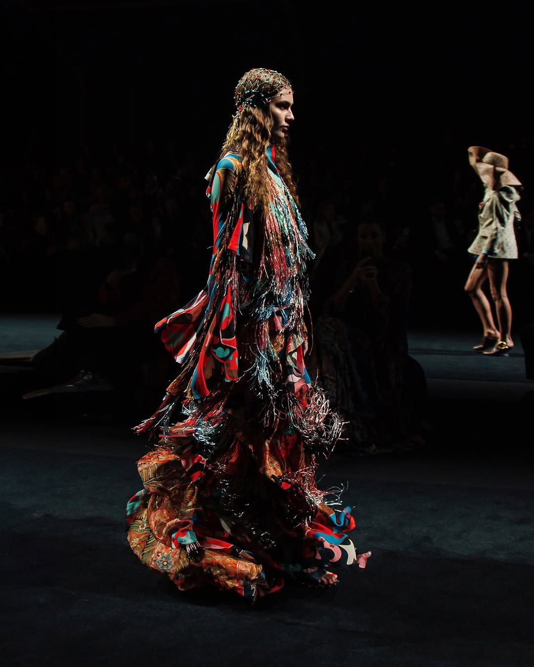 Коллекция открылась гипер-обороченными платьями в хиппи-эстетике, дополненными кожаными жакетами с бахромой. За ними следовали разноцветные кроше-топы, психоделические шаровары и жаккардовые рединготы. Рюши, вышивка, пайетки, лавина принтов и металлизированные жаккарды — все это смешалось в гармоничный хаос, приправленный банданами и пиратскими шляпами.