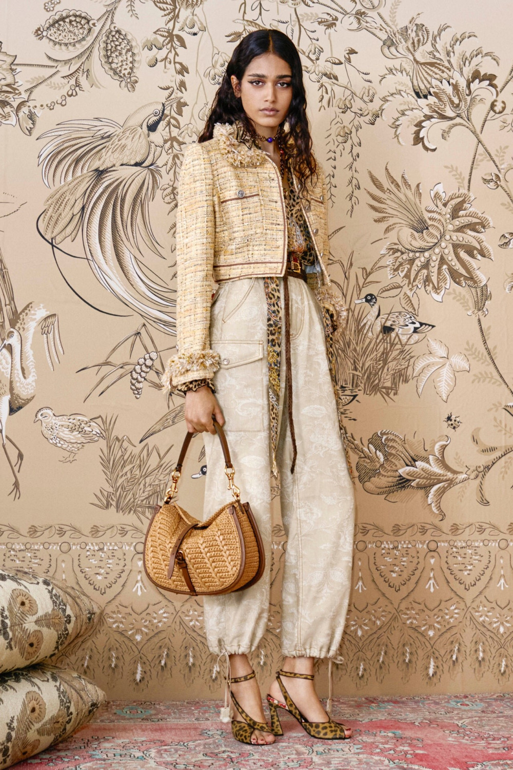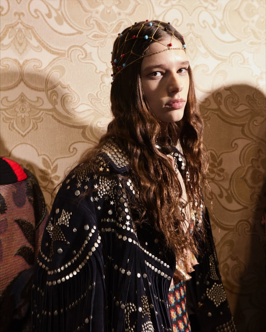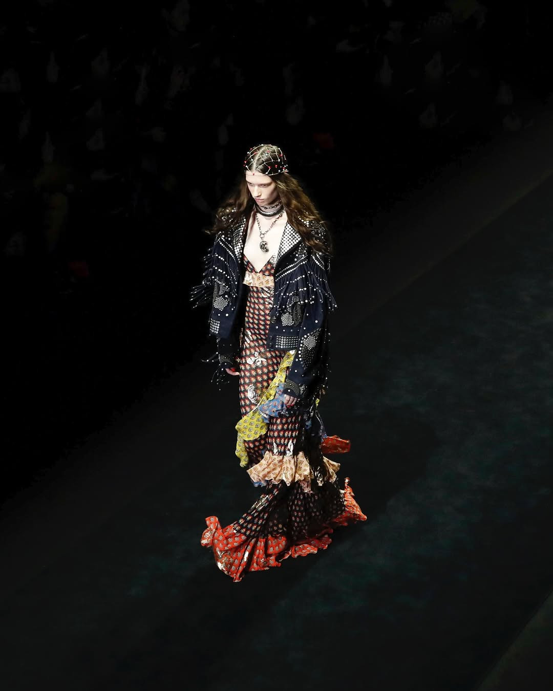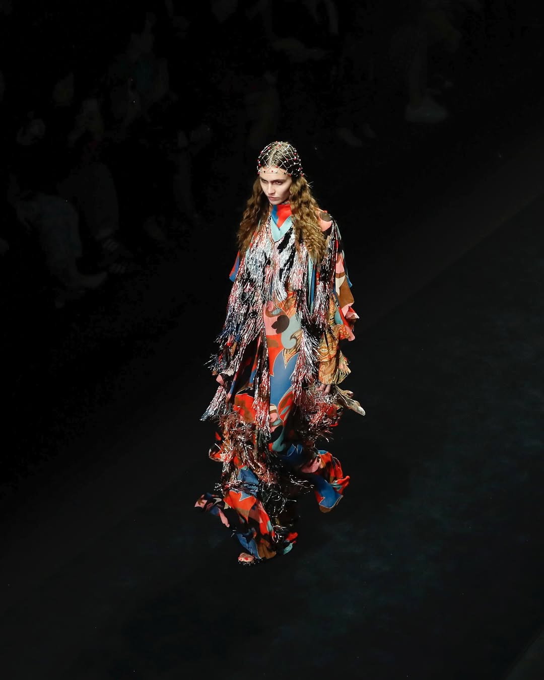 Коллекция открылась гипер-обороченными платьями в хиппи-эстетике, дополненными кожаными жакетами с бахромой. За ними следовали разноцветные кроше-топы, психоделические шаровары и жаккардовые рединготы. Рюши, вышивка, пайетки, лавина принтов и металлизированные жаккарды — все это смешалось в гармоничный хаос, приправленный банданами и пиратскими шляпами.