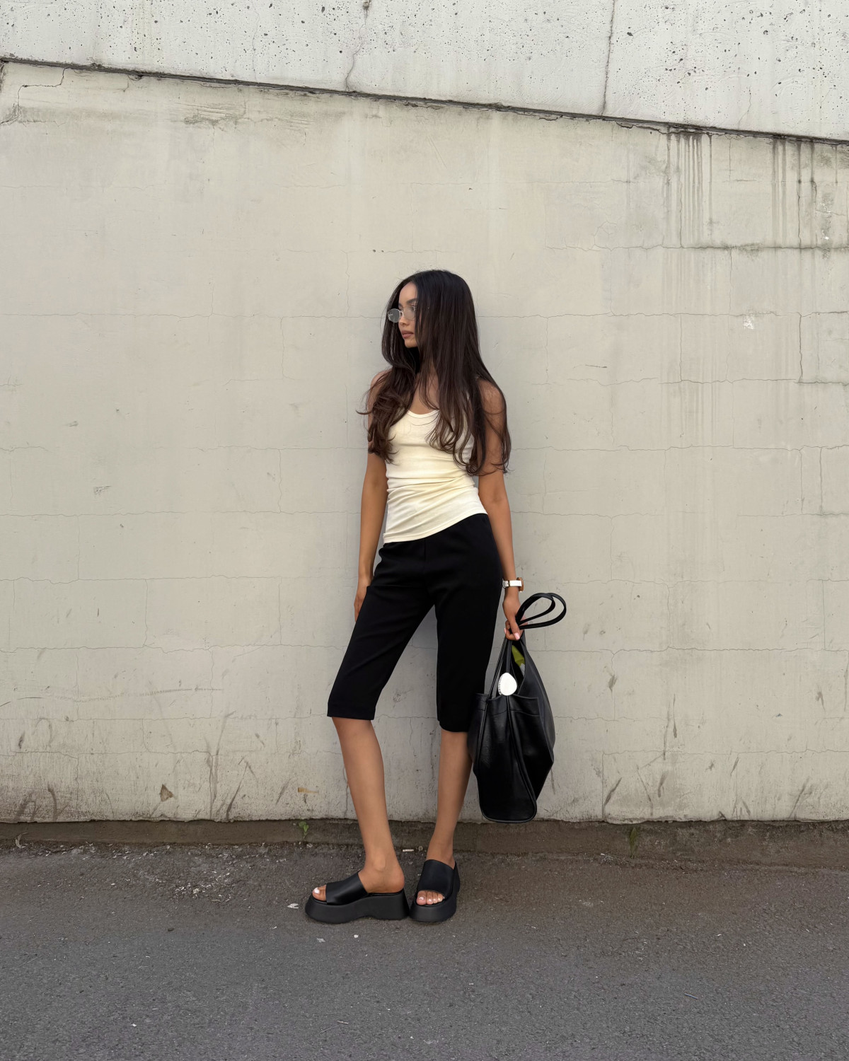 Высокие челси с контрастной подошвой выглядят тяжеловесно и выбиваются из общего образа. Особенно на фоне белой сумки холодного оттенка, в то время как обувь уходит в теплую гамму. Контраст слишком буквальный и стилистически невыверенный.