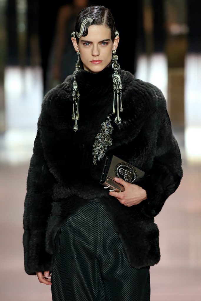 Отсылки к «Орландо» пронизывают всю коллекцию: иногда предстают в виде книжных клатчей в металлическом переплете, иногда – в виде строк из текста, начертанных на перламутровых минодьерах или кожаных сапогах. Отрывки из писем Вирджинии и Виты периода многолетних ухаживаний зачитываются вслух друзьями и членами семьи Fendi на фоне сопровождающей показ музыкальной композиции Макса Рихтера.