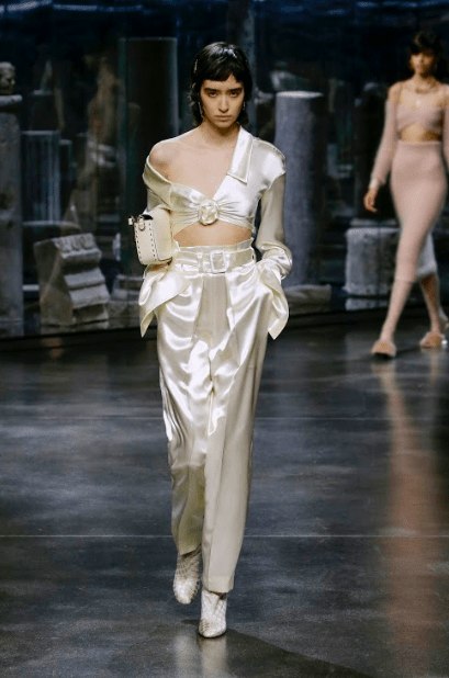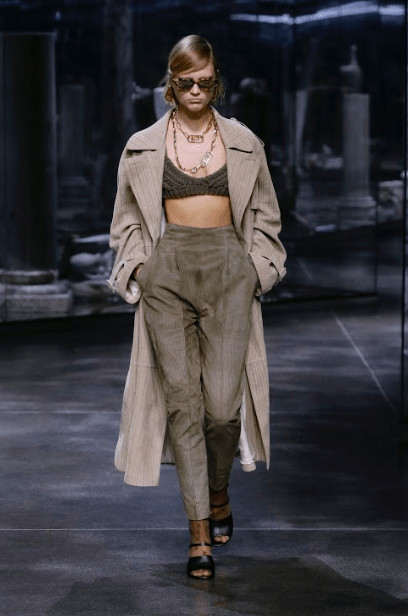 Вся коллекция получилась сдержанной – только монохромные оттенки и ни одного яркого акцента. Ключевым ресурсом стал гардероб пяти сестер Fendi: от рукавов-колокольчиков из «стиранной» норки и замшевых пальто до полосок на их деловых костюмах, теперь воспроизведенных в шелковых рубашках или идеально скроенной шерстяной одежде. Классический жакет-рубашка, вдохновленный повседневной униформой Сильвии Вентурини-Фенди, предстает в новой роскошной версии с подкладкой из норки.