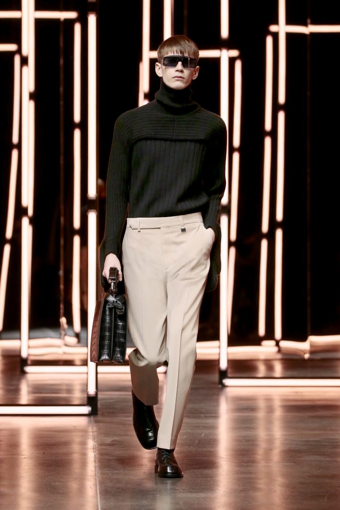 Мультифункциональность и ставшие основой коллекции формы объединяются в двусторонних предметах, имитирующих форму рабочих, и верхней одежде непринужденных силуэтов. Пальто с поясами и тренчкоты из кашемировой фланели, атласа, полосатого меха и овчины излучают уют домашних халатов: пижамные канты по кромкам перемещают домашнюю атмосферу на улицы, а ауру улиц — в дом. Всевозможные вещи из шелкового жакарда – от пальто с большим запашным воротником до пуловеров, курток-рубашек и шорт-бермуд – благодаря диагональной строчке создают ощущение роскошного комфортного кокона, а крой «наизнанку» с деконструированными элементами демонстрирует подкладку с логотипом FF. Чудное и чудесное видение «новой нормы» позволяет добавить переосмысленный узор вязки резинкой и косами на штаны-кальсоны, шарфы кардиганов, манжеты перчаток и свитера с высоким горлом.