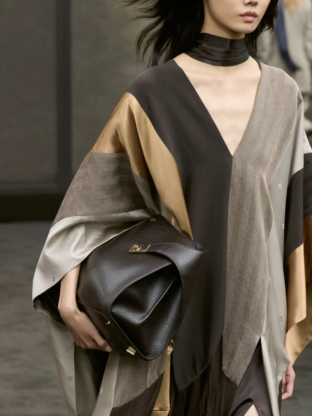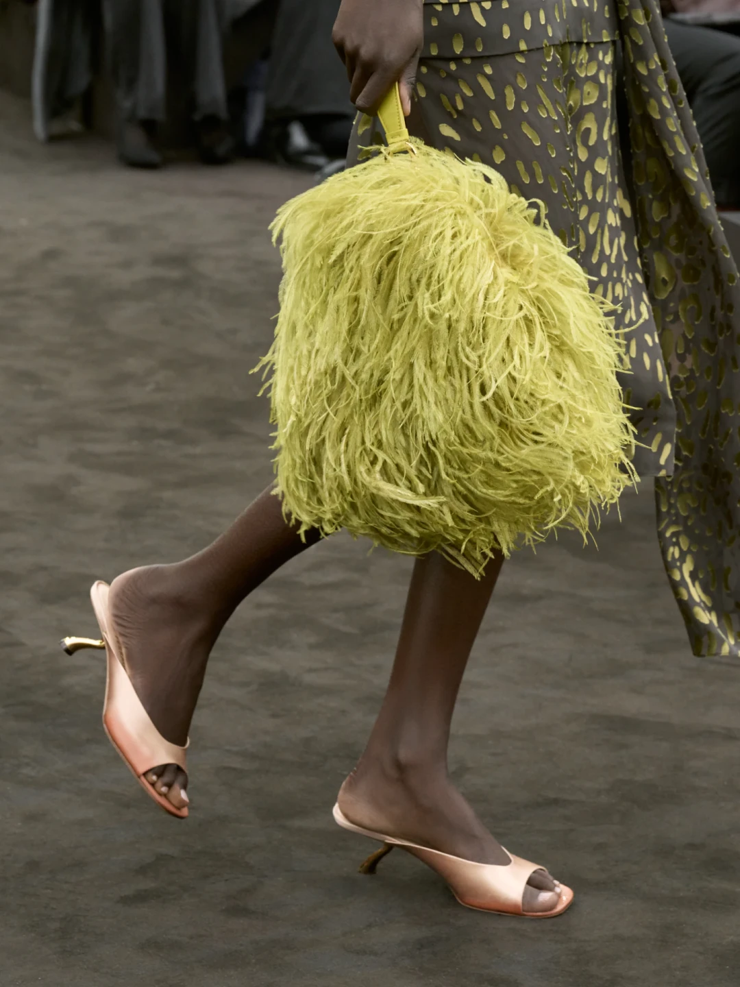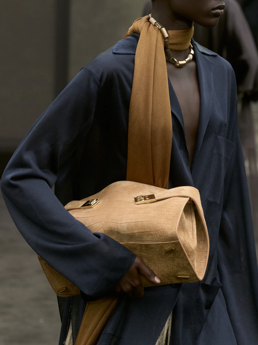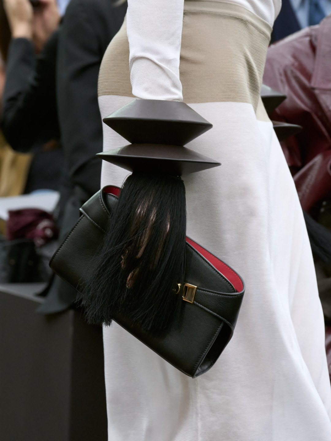 Обувь всегда была сердцем Ferragamo — и в этот раз дизайнер не изменил традициям. Одни модели демонстрировали «клетчатые» туфли в духе 1920-х, но в остром современном прочтении, а другие — сатиновые мюли с бантами и блеском бисера. И все же настоящим фаворитом редакции стала обновленная сумка Hug. В этом сезоне она предстала в трех ипостасях: строгая и сияющая в лакированной коже, роскошная с крокодиловым тиснением и дерзкая — с игривыми перьевыми кистями.