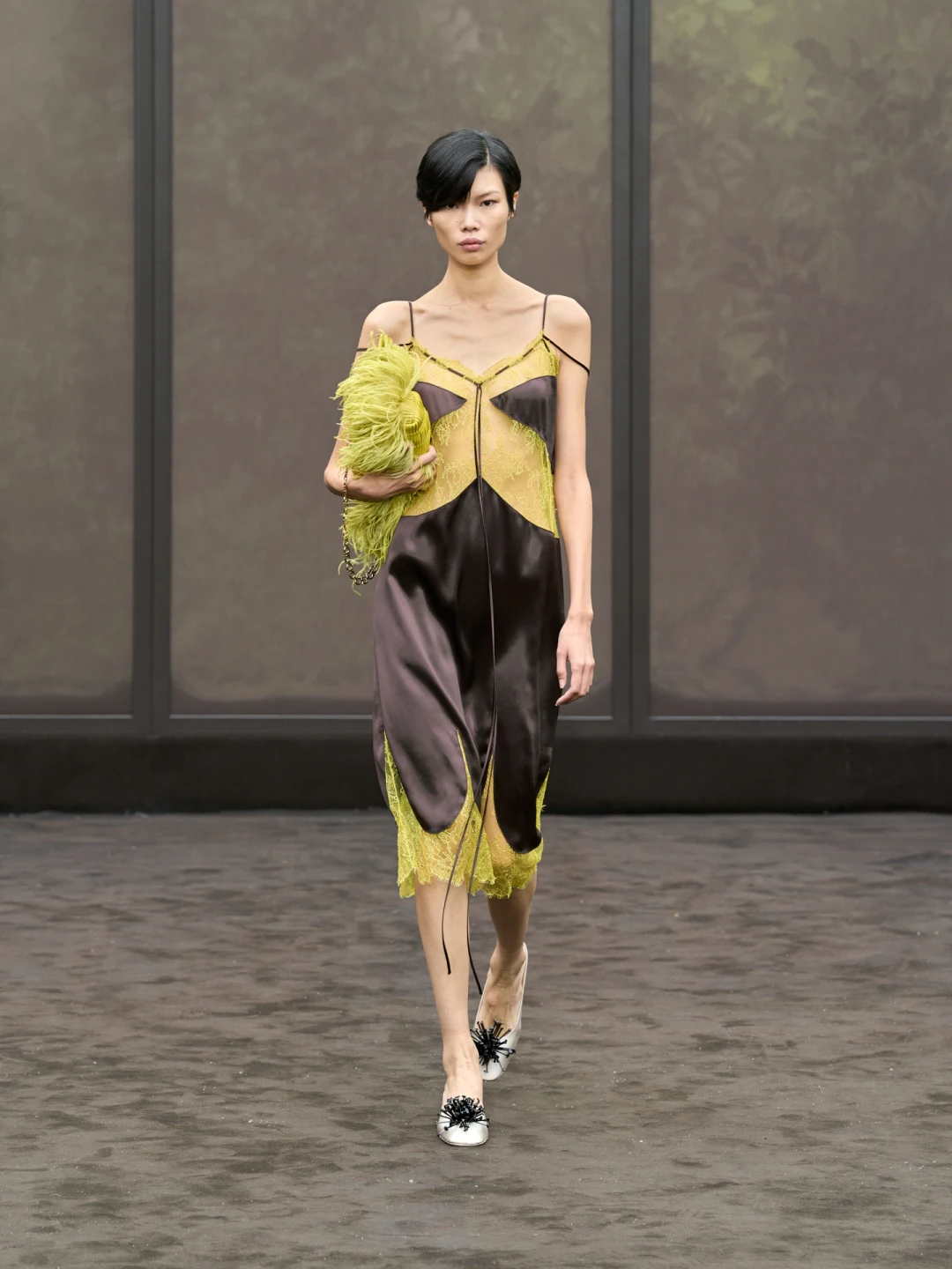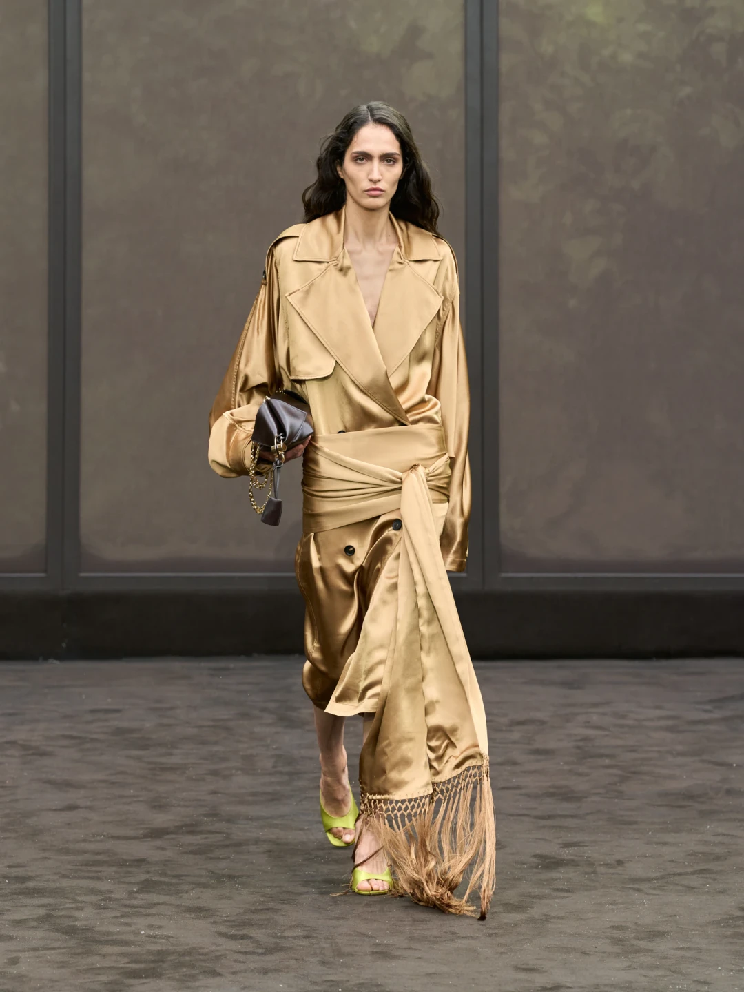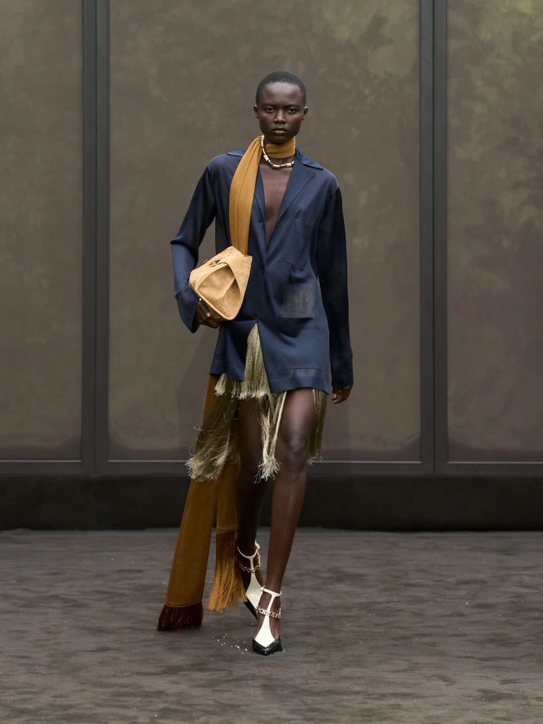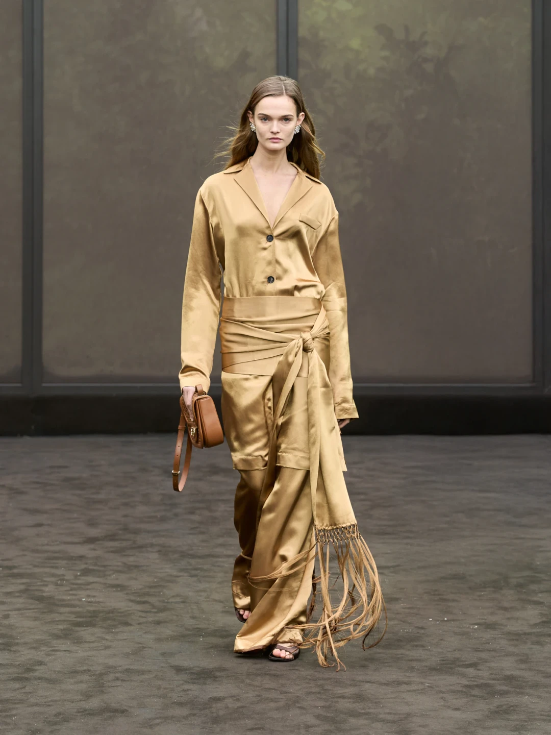Низкая линия талии, отсылающая к небрежно завязанному саронгу, и хищные анималистичные мотивы задали тон коллекции — воздушной, текучей и чувственной. Шелковые пижамные костюмы и невесомые кафтаны сменялись платьями-комбинациями, украшенными тончайшим кружевом и призрачными полупрозрачными вставками. Бахрома спадала с самых неожиданных мест — от ребер до запястий, оживляя силуэты ритмом джаза и воспоминанием о ночах в подпольных барах. И даже строгие костюмы не были лишены кокетства. Галстуки были «спрятаны» в нагрудные карманы, превращая классику в высказывание о новой женственности.
