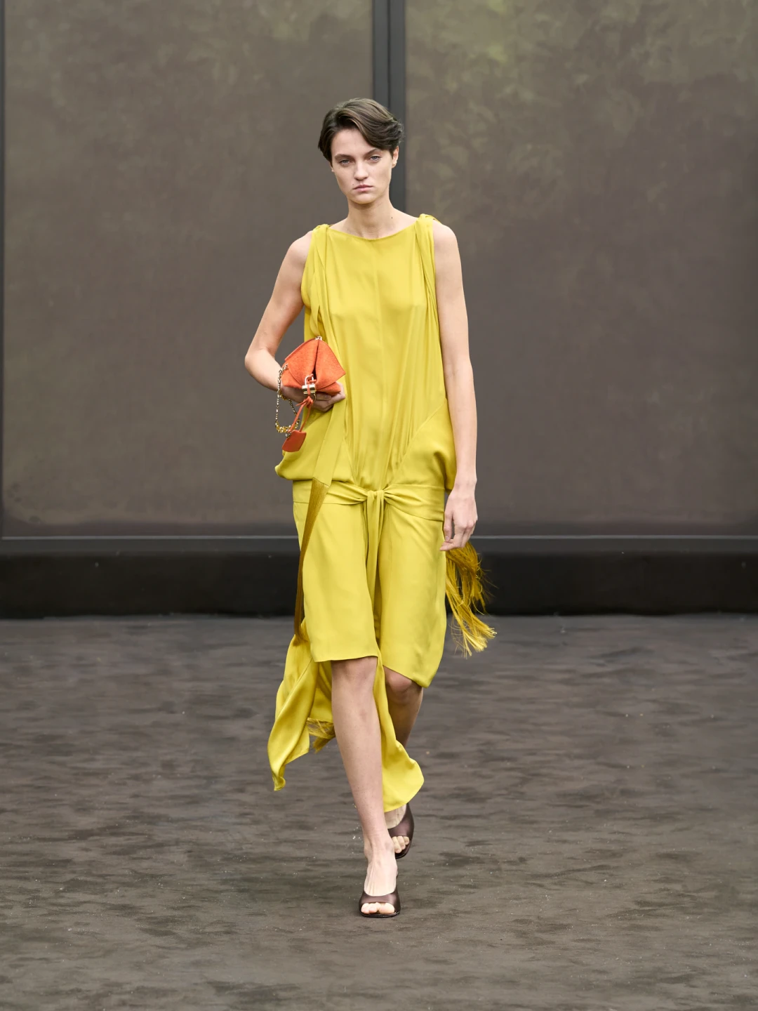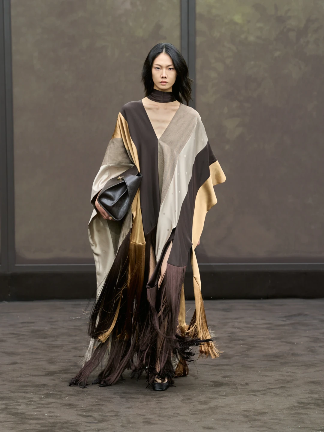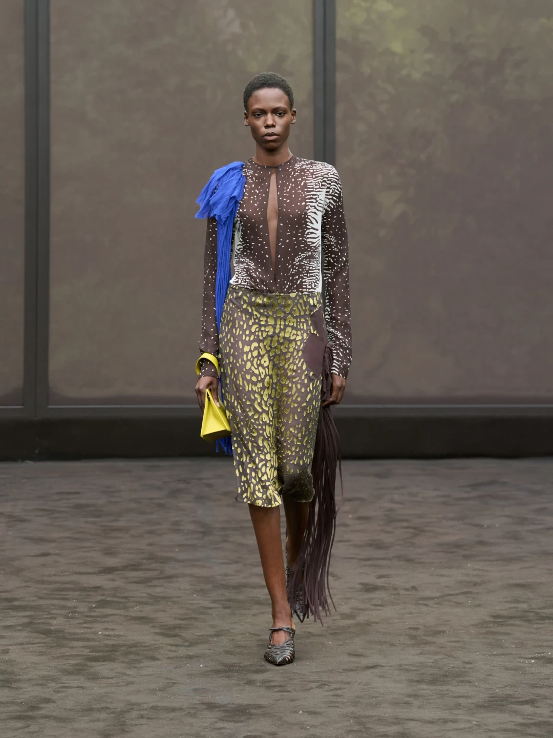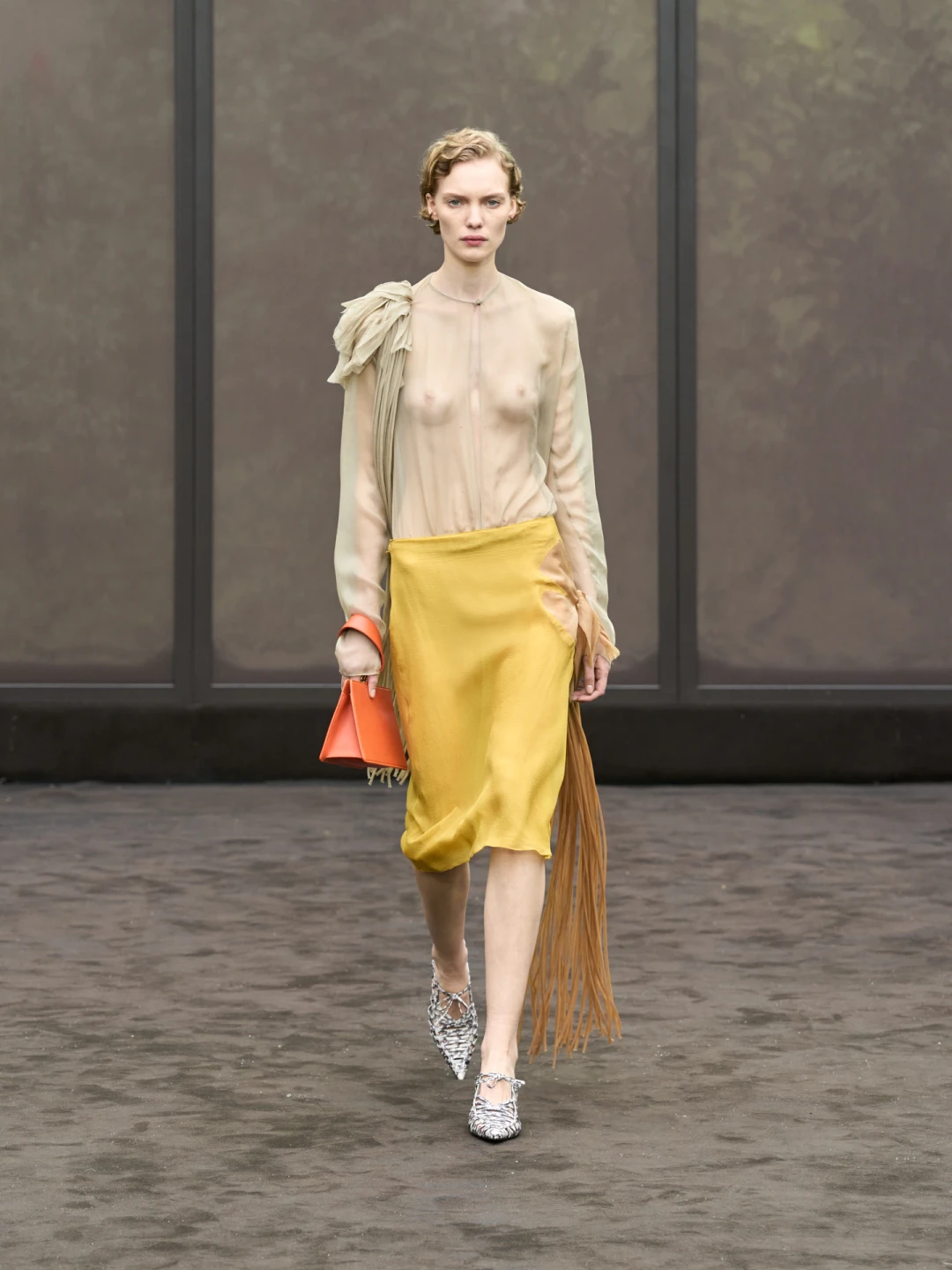 Низкая линия талии, отсылающая к небрежно завязанному саронгу, и хищные анималистичные мотивы задали тон коллекции — воздушной, текучей и чувственной. Шелковые пижамные костюмы и невесомые кафтаны сменялись платьями-комбинациями, украшенными тончайшим кружевом и призрачными полупрозрачными вставками. Бахрома спадала с самых неожиданных мест — от ребер до запястий, оживляя силуэты ритмом джаза и воспоминанием о ночах в подпольных барах. И даже строгие костюмы не были лишены кокетства. Галстуки были «спрятаны» в нагрудные карманы, превращая классику в высказывание о новой женственности.