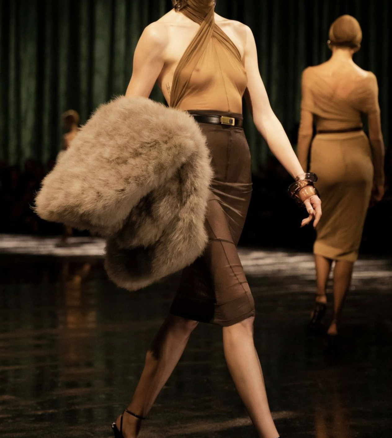 В этом сезоне дизайнеры не ограничились мехом лишь при создании пальто и курток, но и декорировали им аксессуары и обувь. К примеру, Dries Van Noten, Saint Laurent представили «пушистые» сумки», а Acne Studios — мюли.