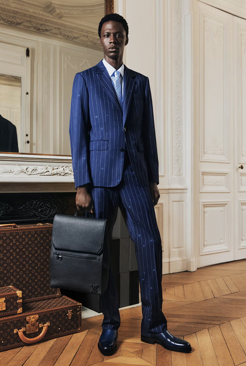 В центре коллекции — строгие образы для бизнес-среды. Глубокий синий костюм в тонкую полоску дополнен рассеянными элементами фирменного паттерна Louis Vuitton, а графитовый вариант украшен текстурным узором Damier и вышитыми LV-монограммами. Эти костюмы остаются верны классике, но при этом предлагают свежий взгляд на офисный стиль. В свою очередь, трикотажный свитер и жакет без воротника расшиты сверкающими пайетками, а рубашка дополнена игривым бантом.