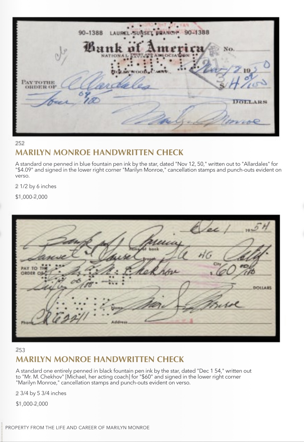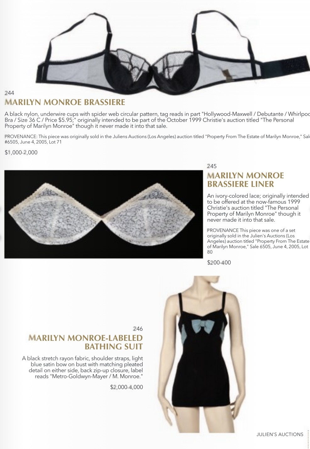 Аукцион Julien’s Auction предлагает поклонникам Монро и не только приобрести ее личные вещи. Среди представленных предметов: туфли, украшения, банковские счета, упаковки от лекарств и даже нижнее белье. Особые ценители творчества актрисы могут приобрести ее костюмы из мировых лент. Например, образ звезды из фильма «Джентельмены предпочитают блондинок» планируют продать за 100 тысяч долларов.