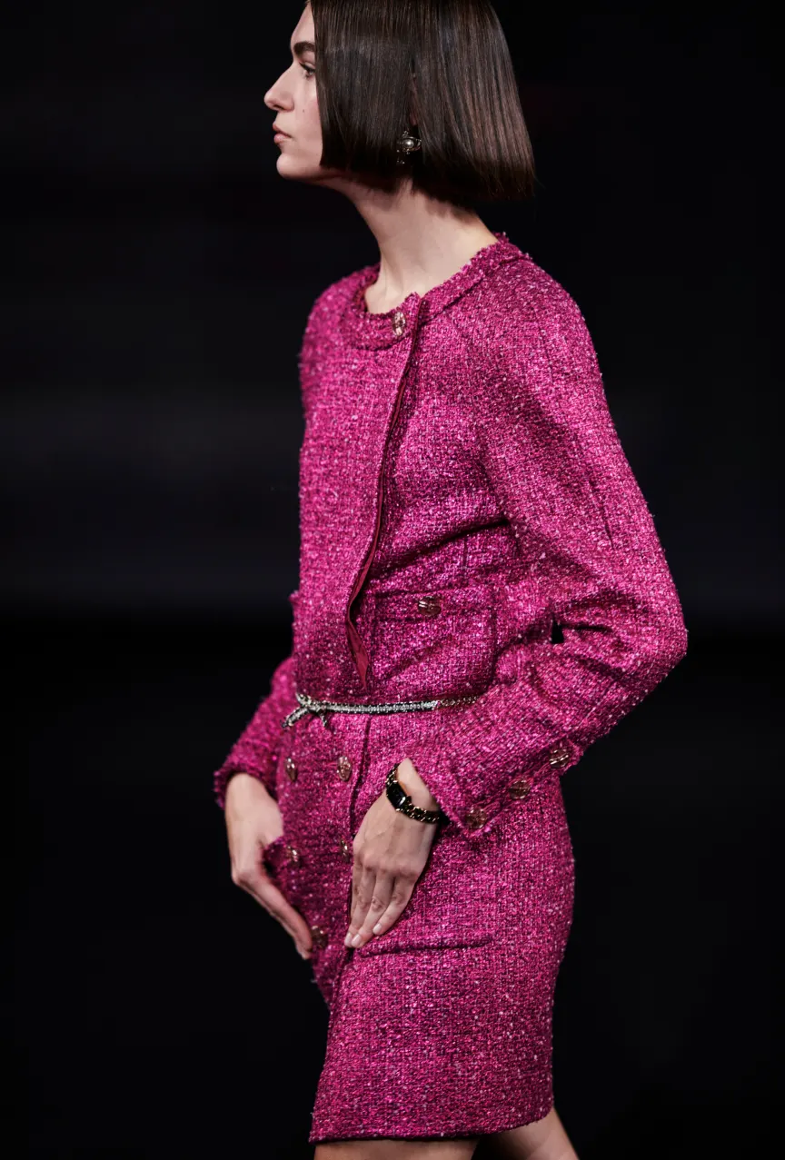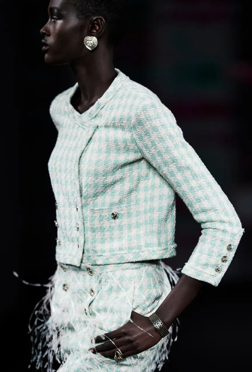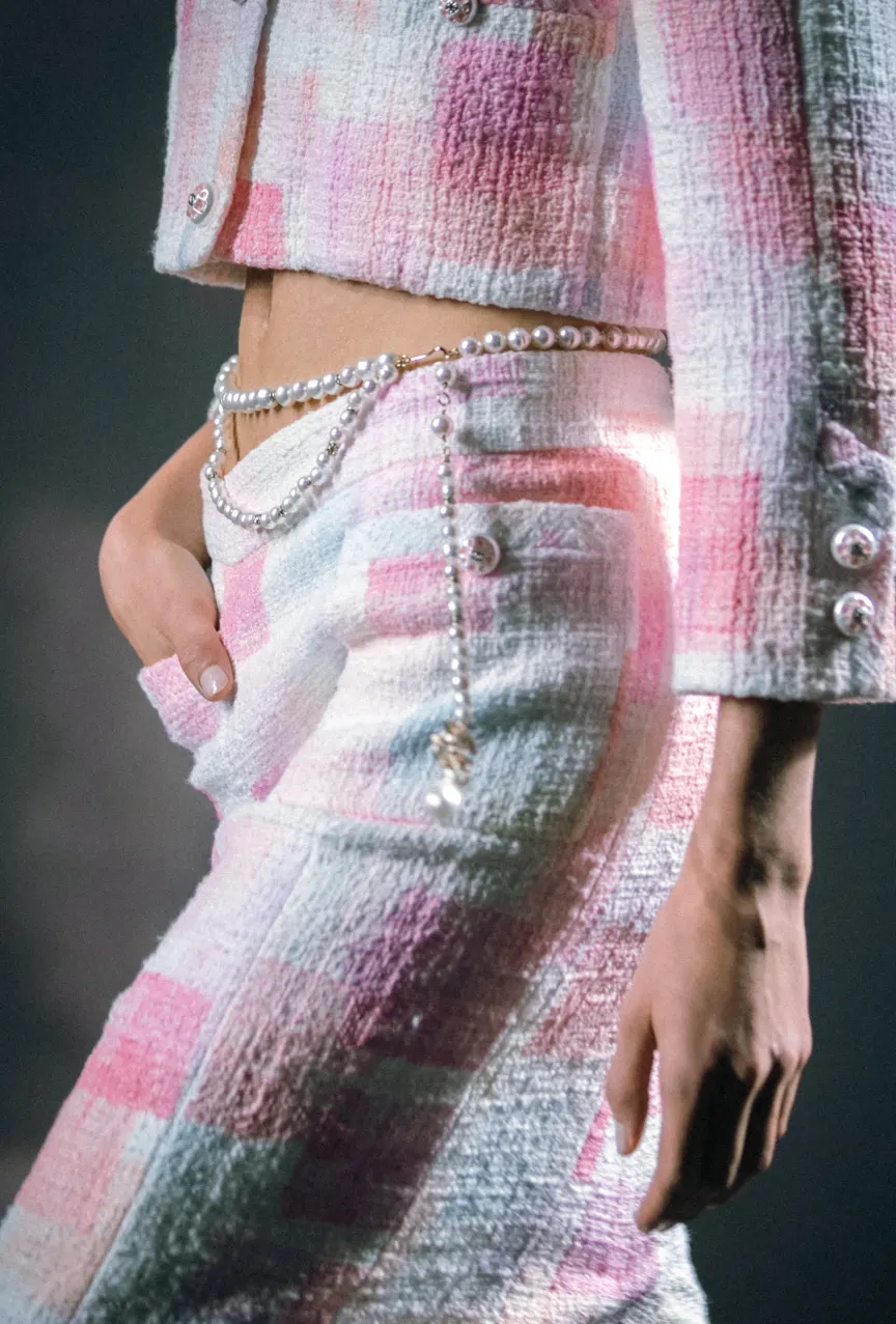 Если Valentino решил попрощаться с розовым, то Chanel, наоборот, привнес его в последнюю коллекцию. Виржини представила нежные образы в зефирных оттенках, которые были дополнены легкомысленными перьями и жидким золотом. Стоит отметить, что в Chanel с особым трепетом отнеслись к деталям. Так, идеальным дополнением к образам стали перчатки с бантиками, серьги-наперстки, чехлы для помад на шее и даже кейс для теней в виде открытой палетки.