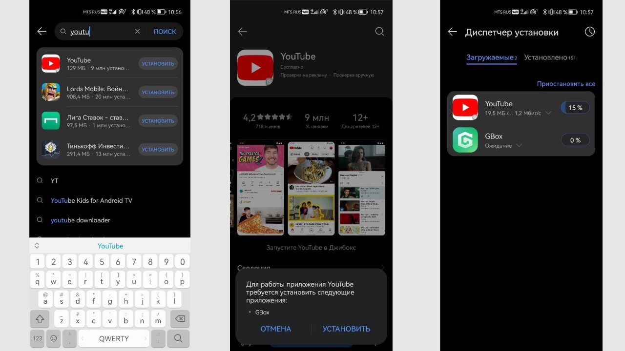 Шаг 1. Находим в поисковой строке AppGallery «YouTube», нажимаем «Установить» и соглашаемся на установку GBox.