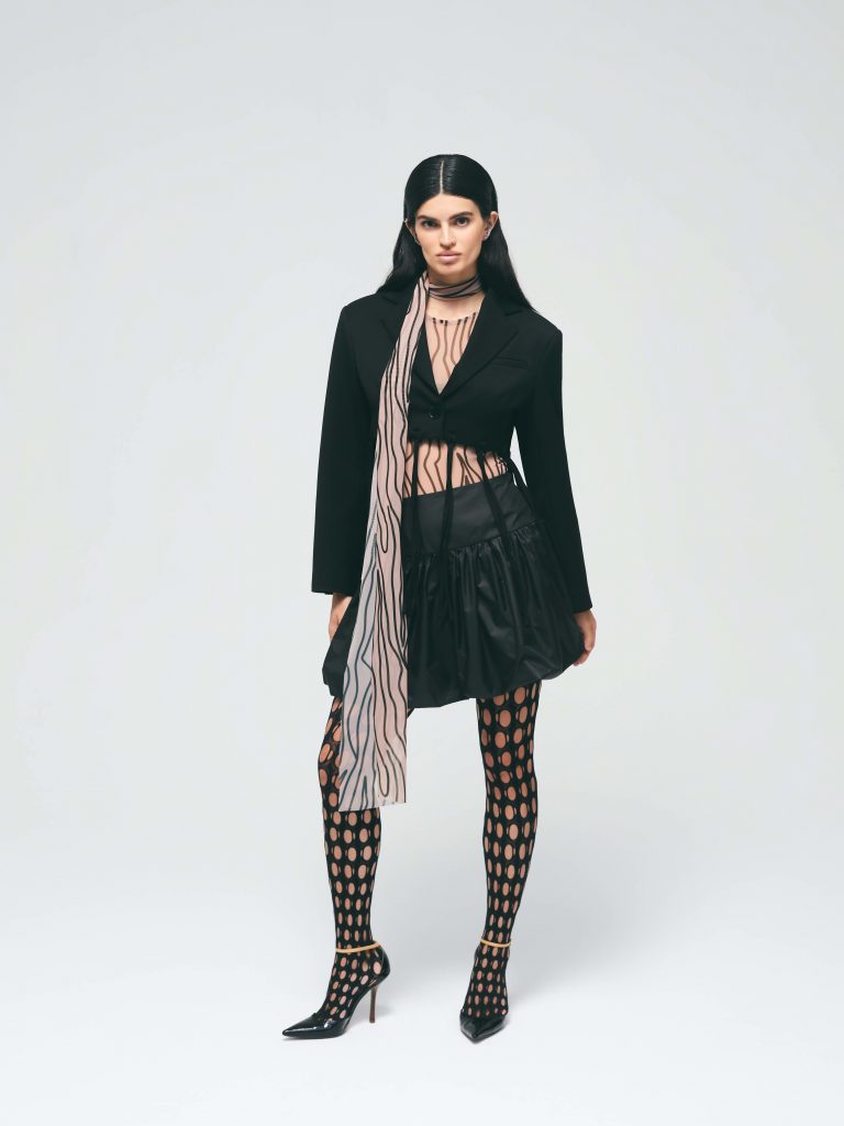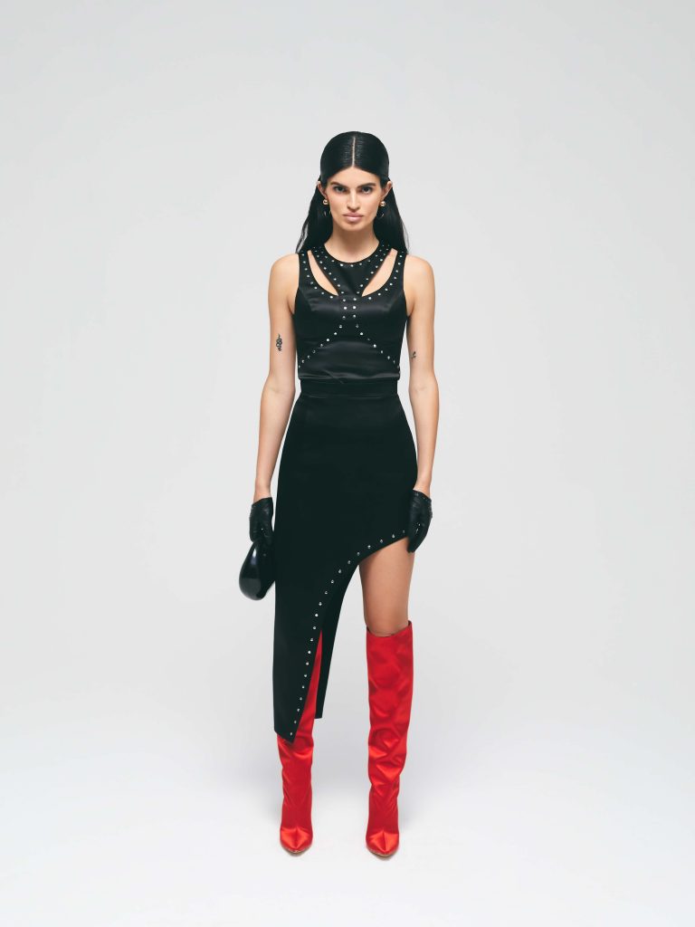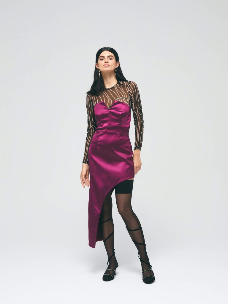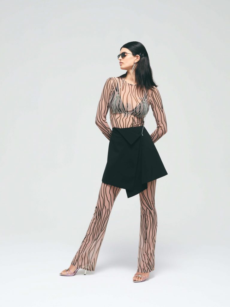 В новогодней коллекции, пожалуй, собраны одни из самых подходящих образов для новогодней ночи — костюмы с укороченными жакетами, корсетные топы, лонгслив из сетки, брюки с хлястами, а также платья с ассиметричным низом. Иными словами, все то в чем обычно блистают модницы из разных уголков планеты. Легкие полупрозрачные ткани, необычные вырезы и фасоны добавляют новогодней коллекции нарочитой сексуальности и смелости.