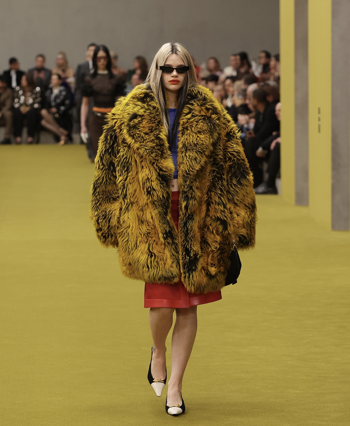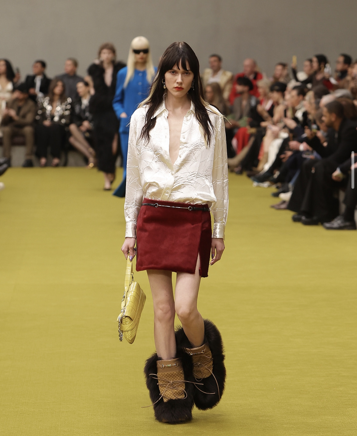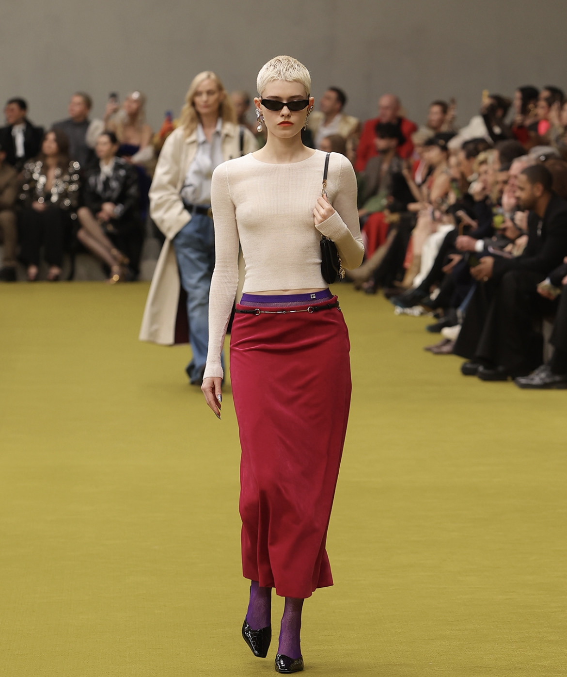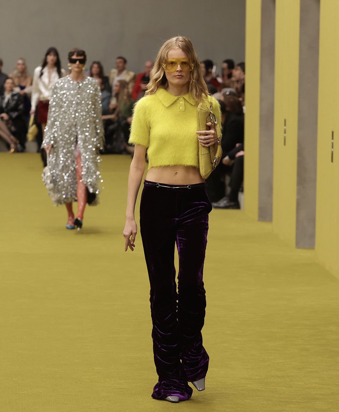Бархатные брюки с низкой талией сочетались с пушистым желтым свитером, облегающее «помятое» платье было надето с меховыми ботинками, а не с сексуальными шпильками, классические юбки были дополнены колготками неонового цвета, что выглядывали из пояса — Gucci пока находится в переходном периоде. Безумное сочетание, казалось бы, несочетаемого — новой коллекцией старались угодить буквально каждому.