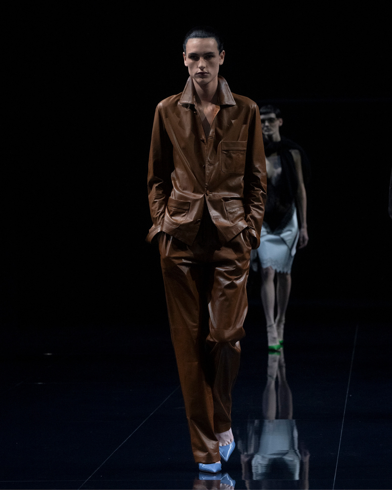 Коллекция держала тонкий баланс между откровенностью и строгостью. Женские силуэты соединяли противоположности: строгие пиджаки скрывали и одновременно позволяли мелькнуть треугольным бра-топам, а будуарные наряды из кружев «растворялись» на коже, оставляя лишь прозрачный намек на линию груди.