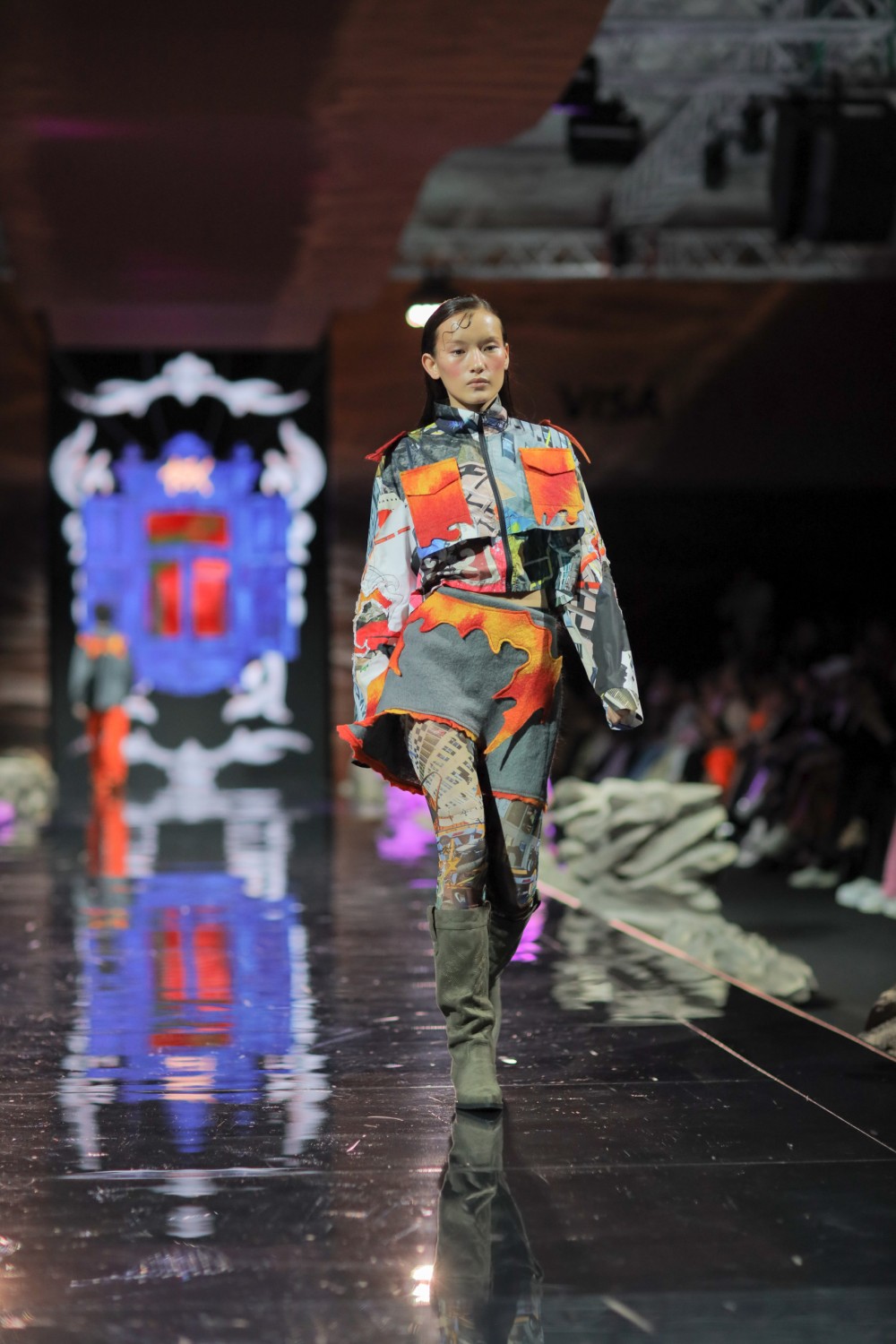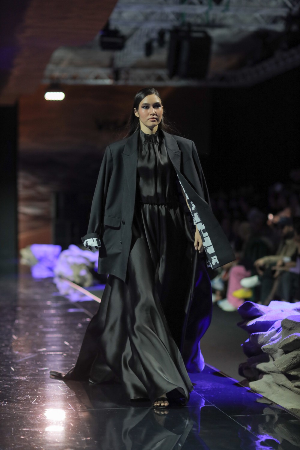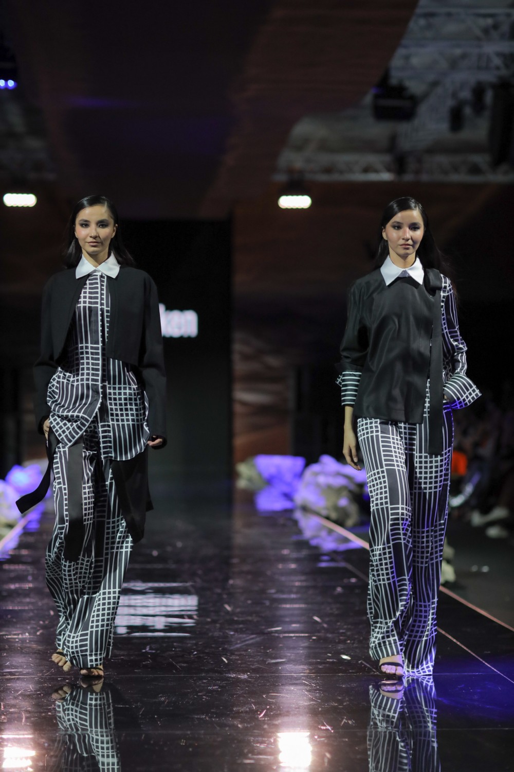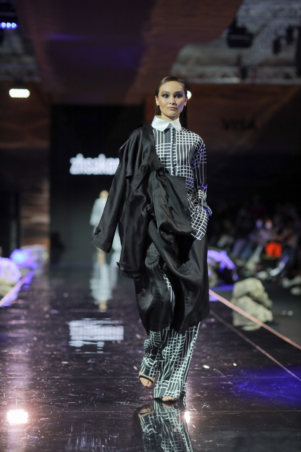Представленная коллекция Isolasian посвящена информационному шуму и изоляции. «Мы все живем в пузырях, созданных информационными алгоритмами, порой изолирующими нас от правды и от самих себя», — заявляет дизайнер. Это отражается и в вещах: серые костюмы, скрывающие в орнаментальных прорезях горящее пламя, двойки с принтом в виде построенных друг на друге городских сооружений, оставляя мало места для воздуха. Кстати, автором уникального принта выступил уличный фотограф и казахстанский художник Дамир Мухаметов, создатель документальной видео-арт работы «Шумовой этюд».