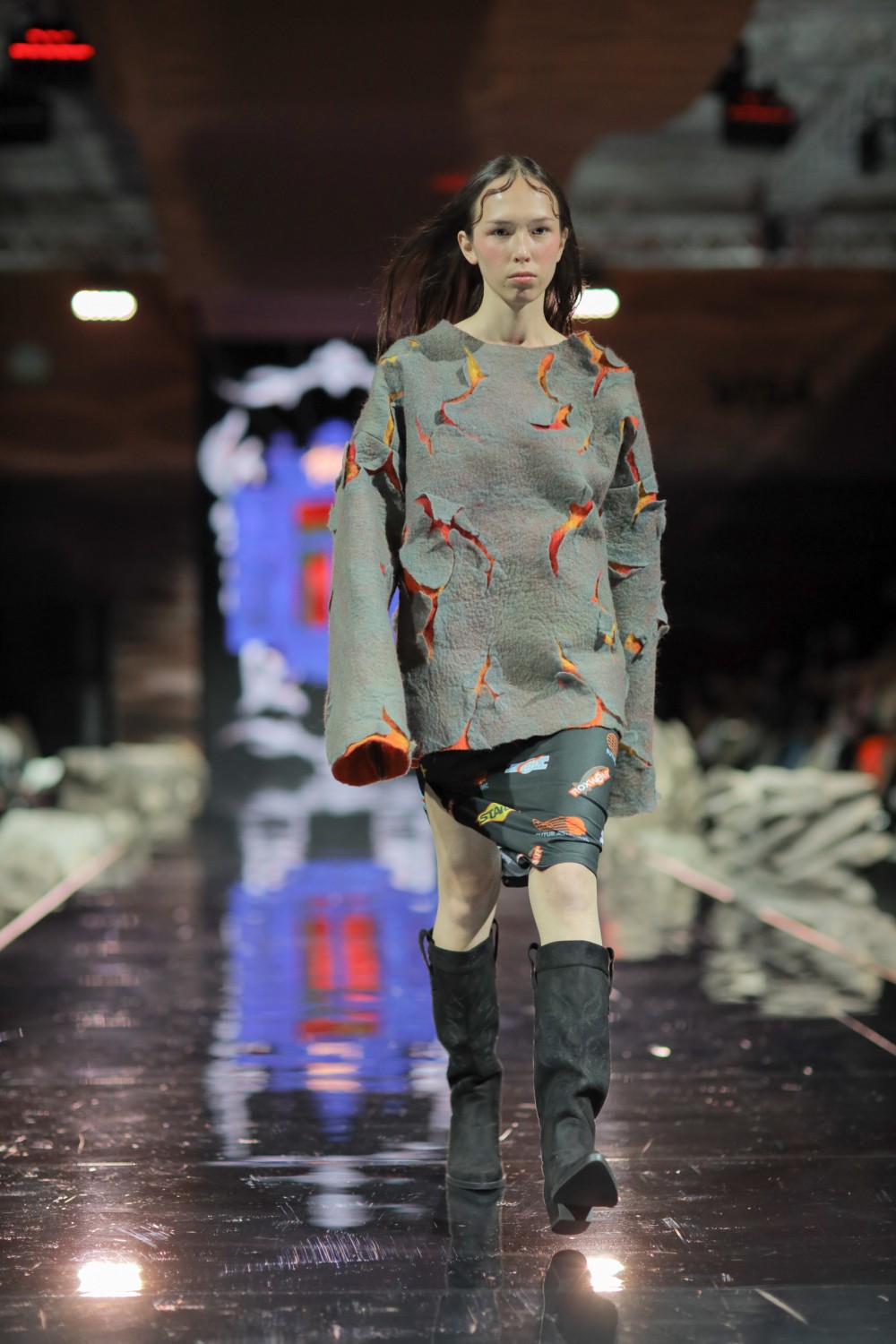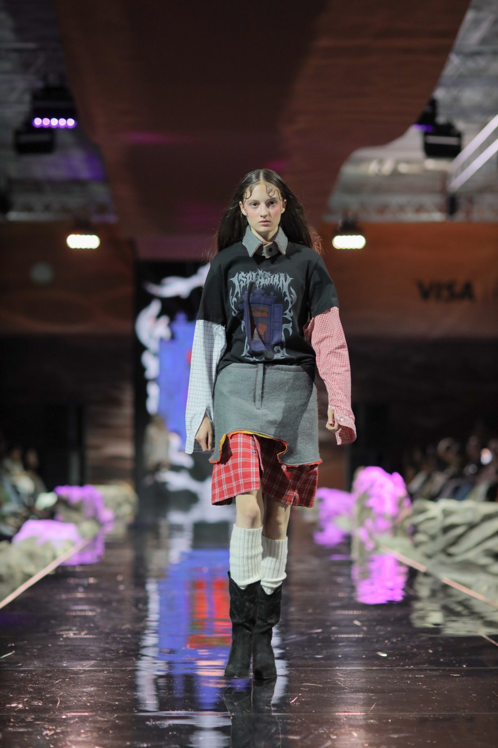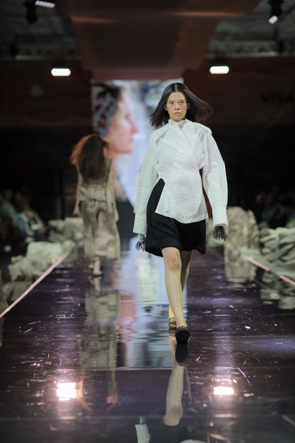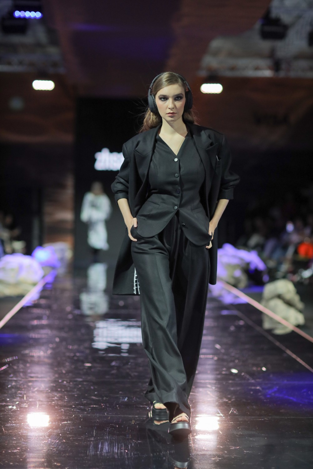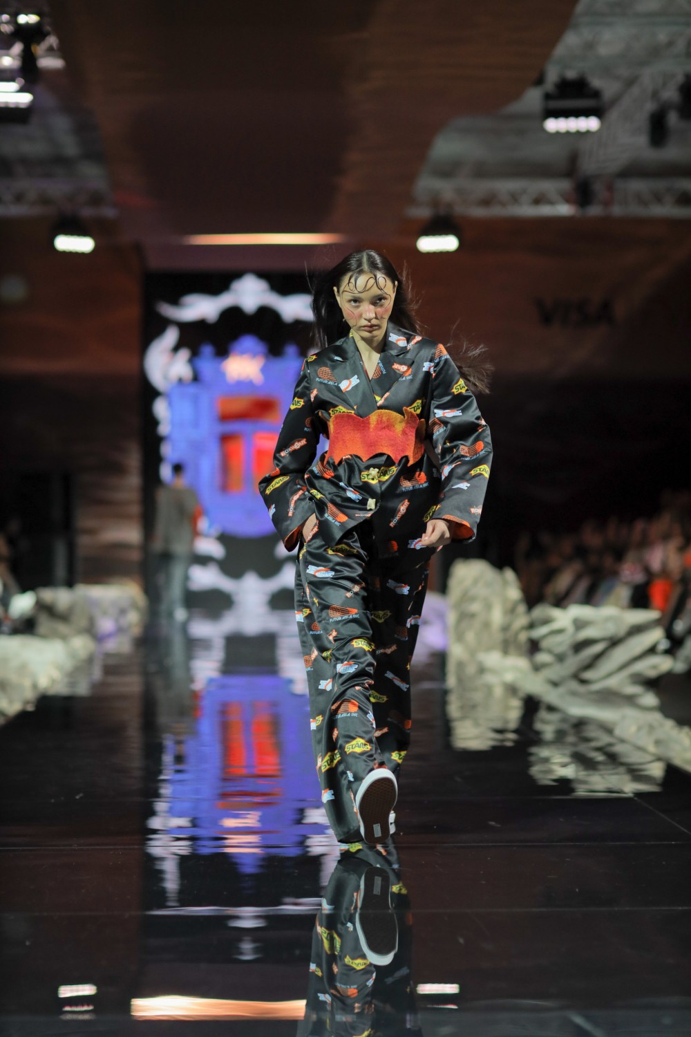 Представленная коллекция Isolasian посвящена информационному шуму и изоляции. «Мы все живем в пузырях, созданных информационными алгоритмами, порой изолирующими нас от правды и от самих себя», — заявляет дизайнер. Это отражается и в вещах: серые костюмы, скрывающие в орнаментальных прорезях горящее пламя, двойки с принтом в виде построенных друг на друге городских сооружений, оставляя мало места для воздуха. Кстати, автором уникального принта выступил уличный фотограф и казахстанский художник Дамир Мухаметов, создатель документальной видео-арт работы «Шумовой этюд».