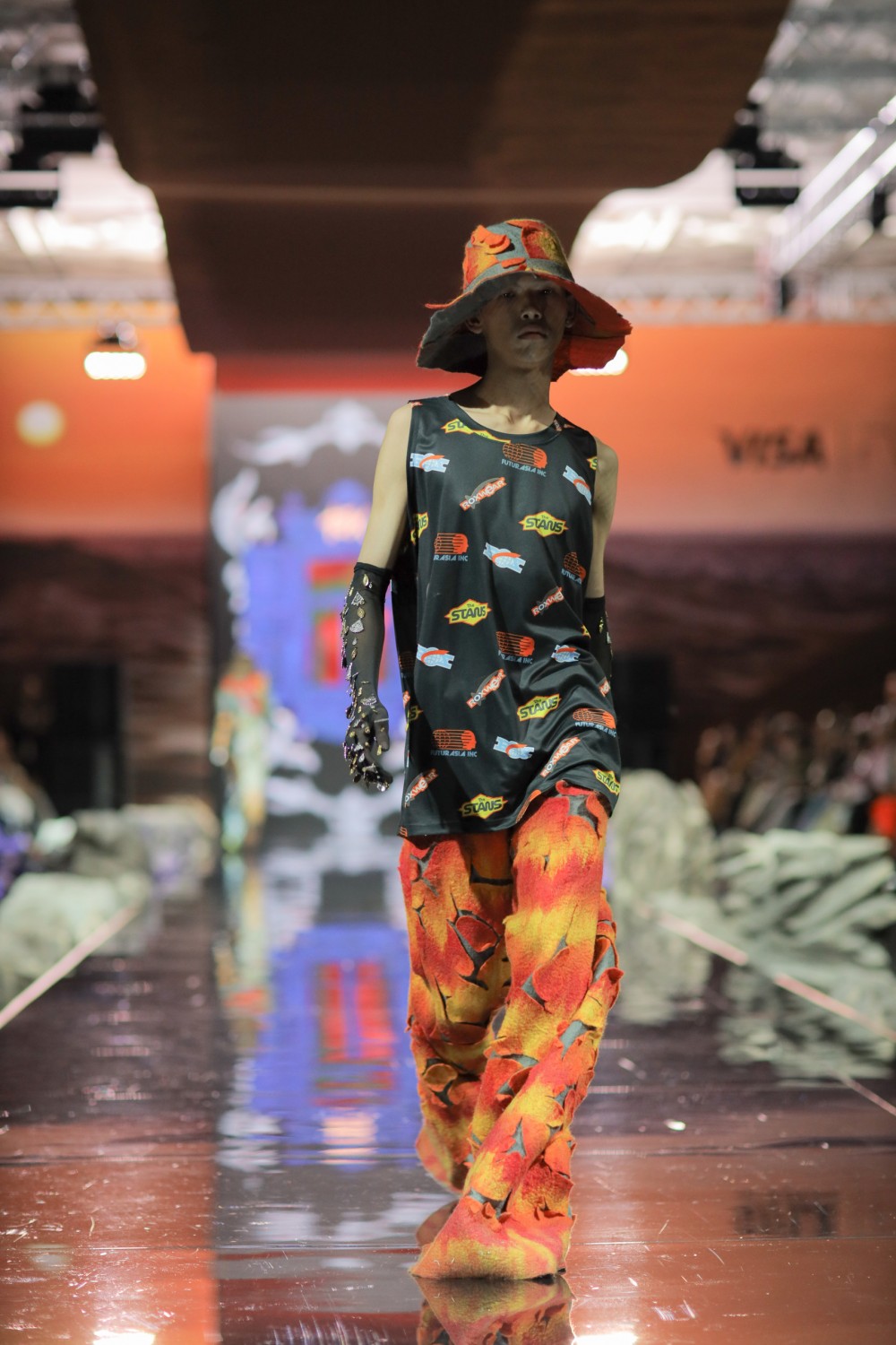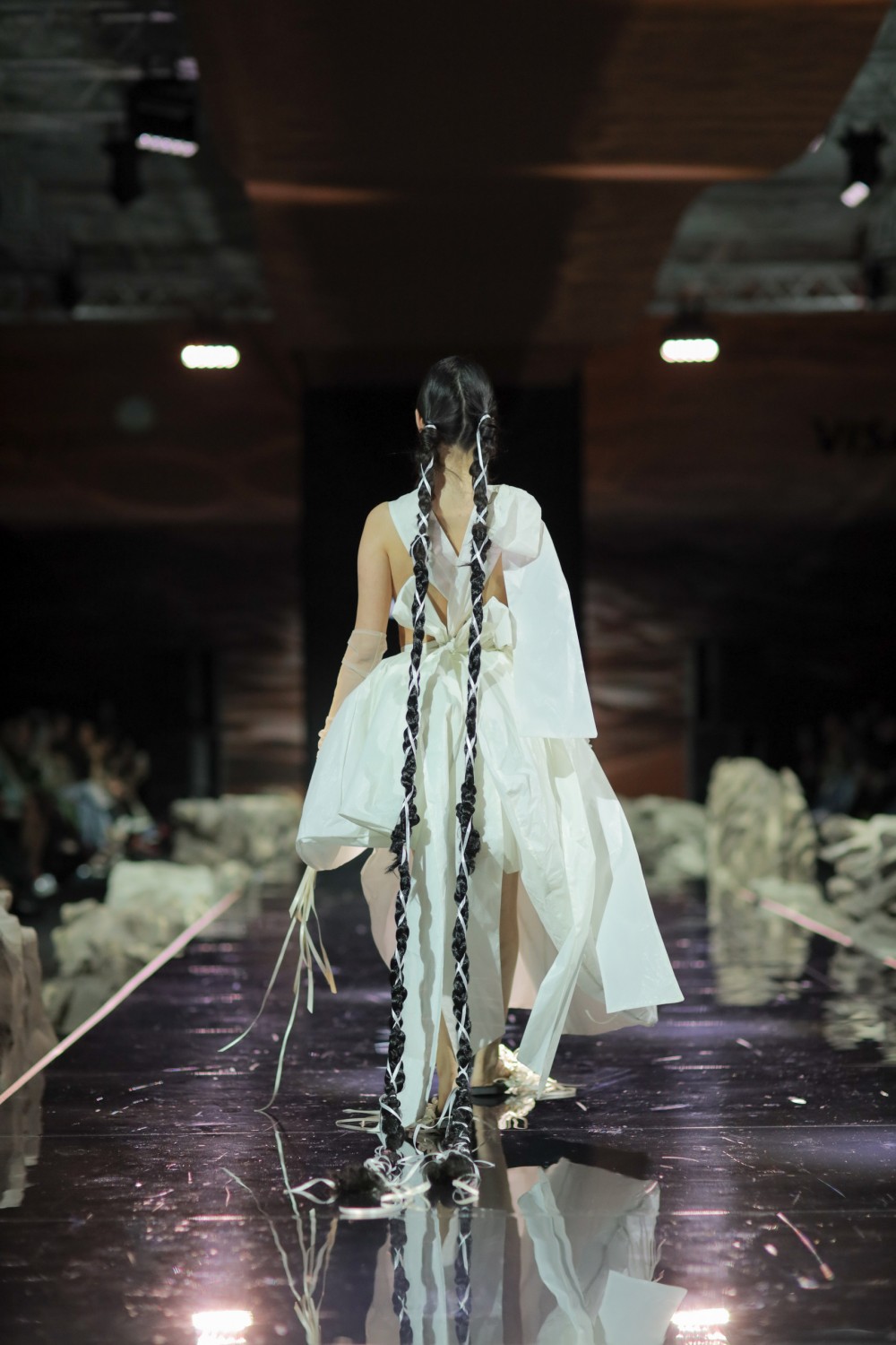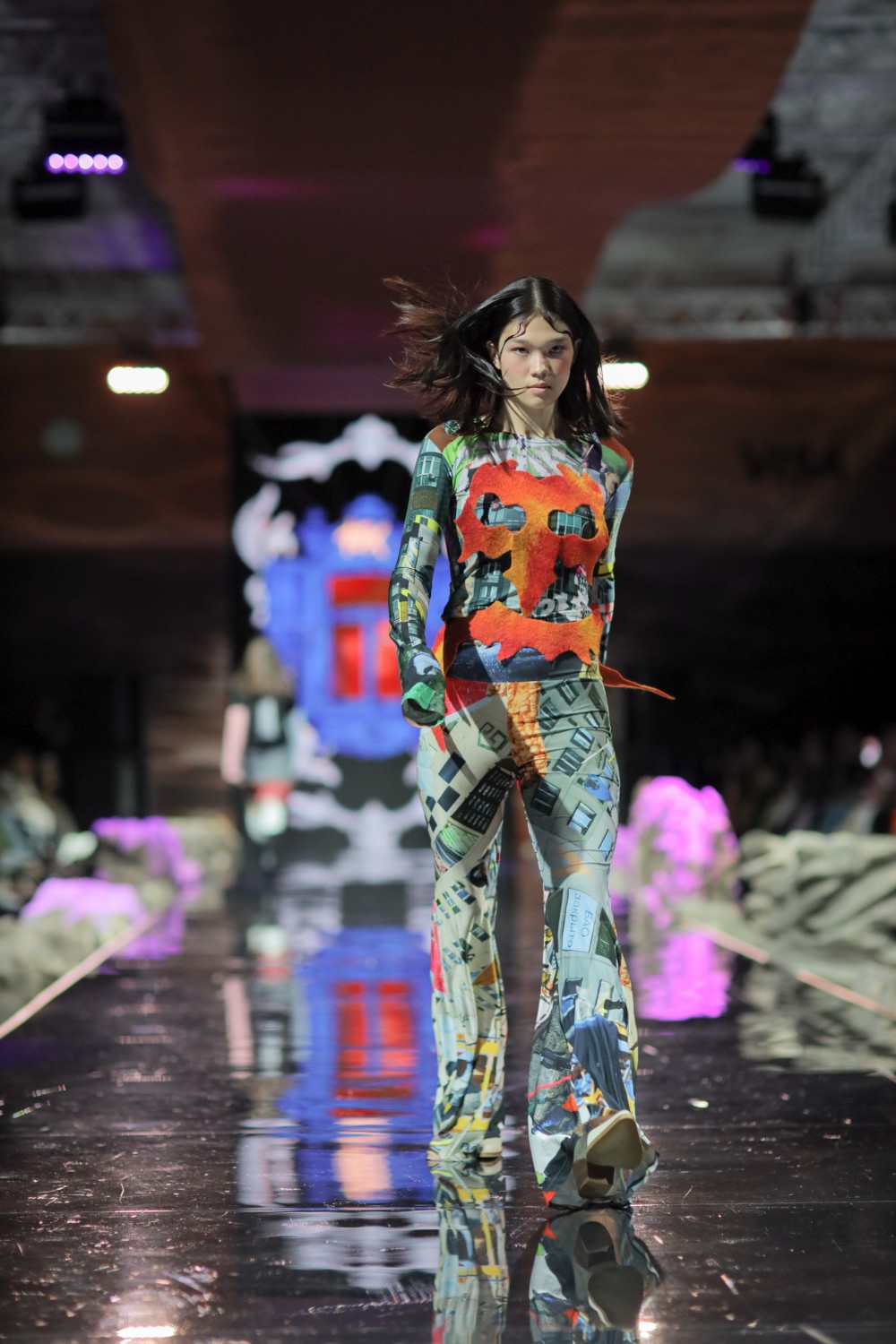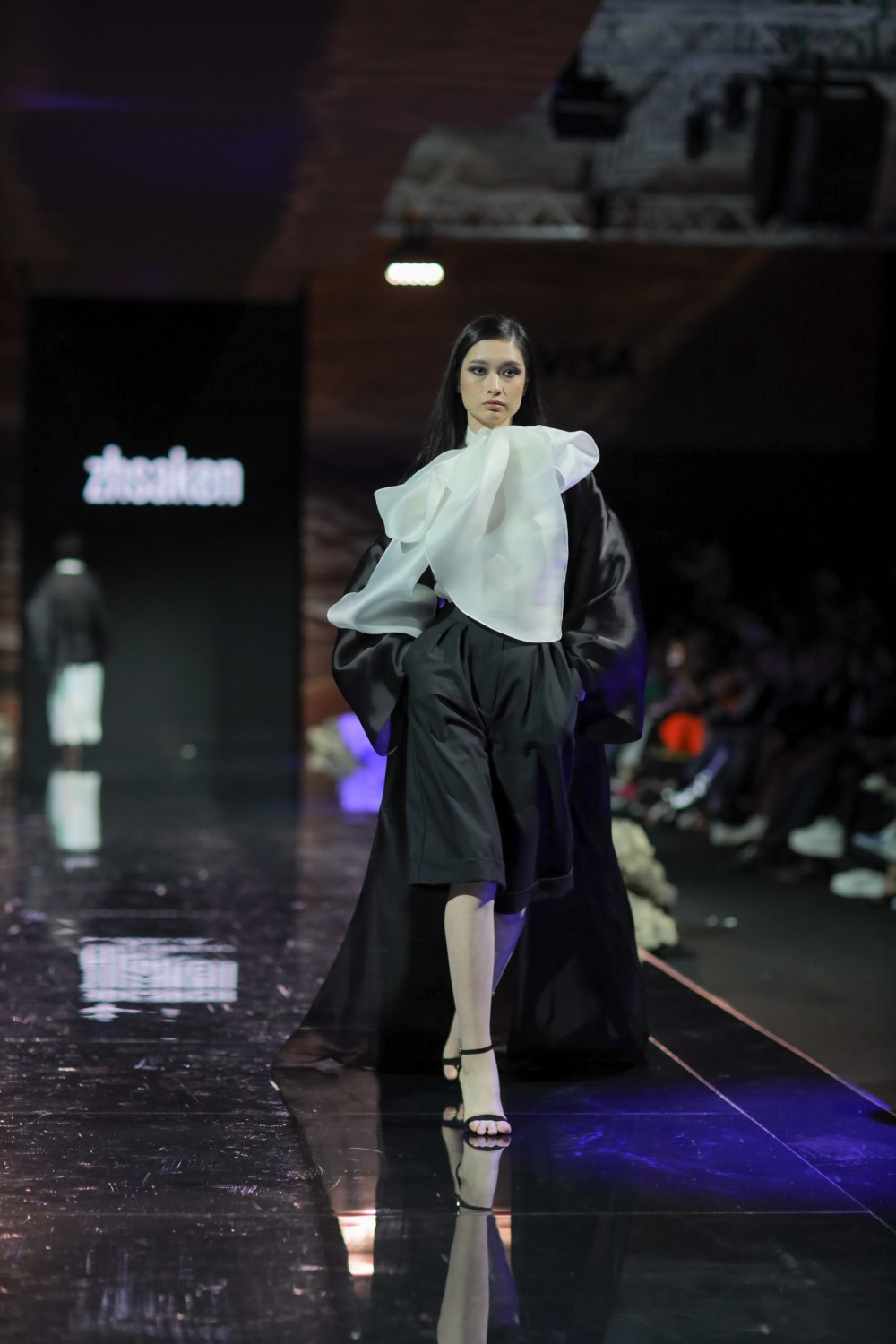 Представленная коллекция Isolasian посвящена информационному шуму и изоляции. «Мы все живем в пузырях, созданных информационными алгоритмами, порой изолирующими нас от правды и от самих себя», — заявляет дизайнер. Это отражается и в вещах: серые костюмы, скрывающие в орнаментальных прорезях горящее пламя, двойки с принтом в виде построенных друг на друге городских сооружений, оставляя мало места для воздуха. Кстати, автором уникального принта выступил уличный фотограф и казахстанский художник Дамир Мухаметов, создатель документальной видео-арт работы «Шумовой этюд».