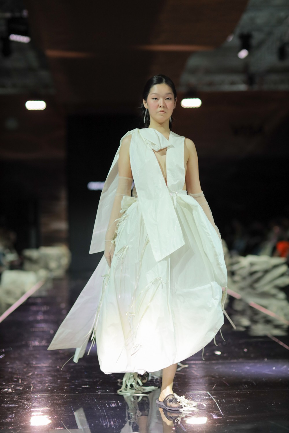 Особое внимание привлекли вязаные изделия, выполненные из тонкой пряжи из шерсти альпаки: здесь и белоснежные кардиганы с многочисленными карманами, и балаклава, переходящая в воротник, и трикотажное пальто до пола с крупной вязкой. Финальный лук коллекции — платье с огромным бантом и асимметричной юбкой, близкое по эстетике Simone Rocha — наш абсолютный фаворит.