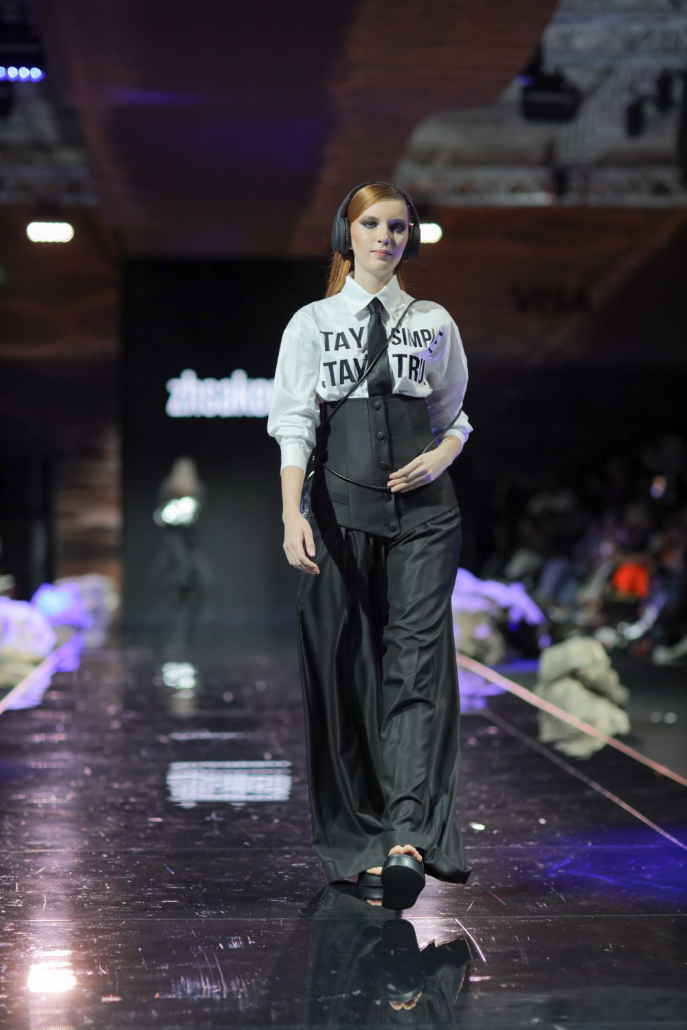 ZhSaken представляет новое видение офисного дресс-кода. Одним из ярких результатов этого переосмысления стал галстук, который добавляет игривости к образу без излишней строгости. Жаксыбаев предлагает носить аксессуар с белой рубашкой со слоганами вместе с корсетной баской.