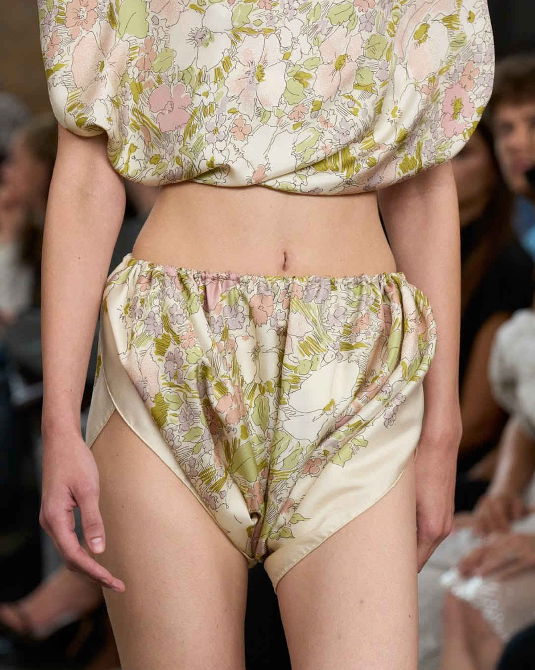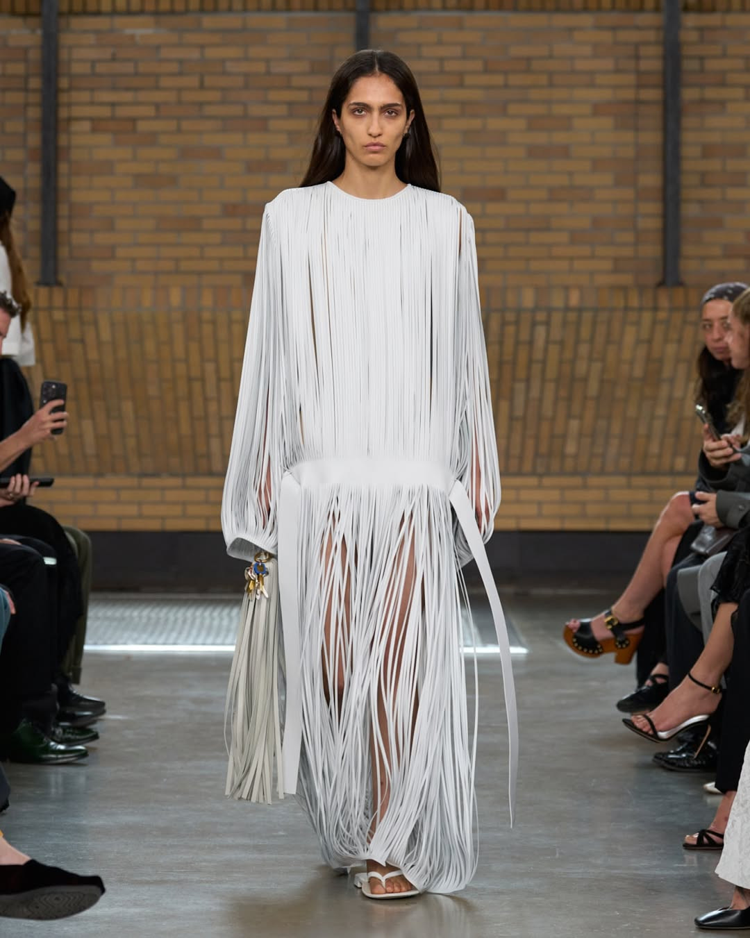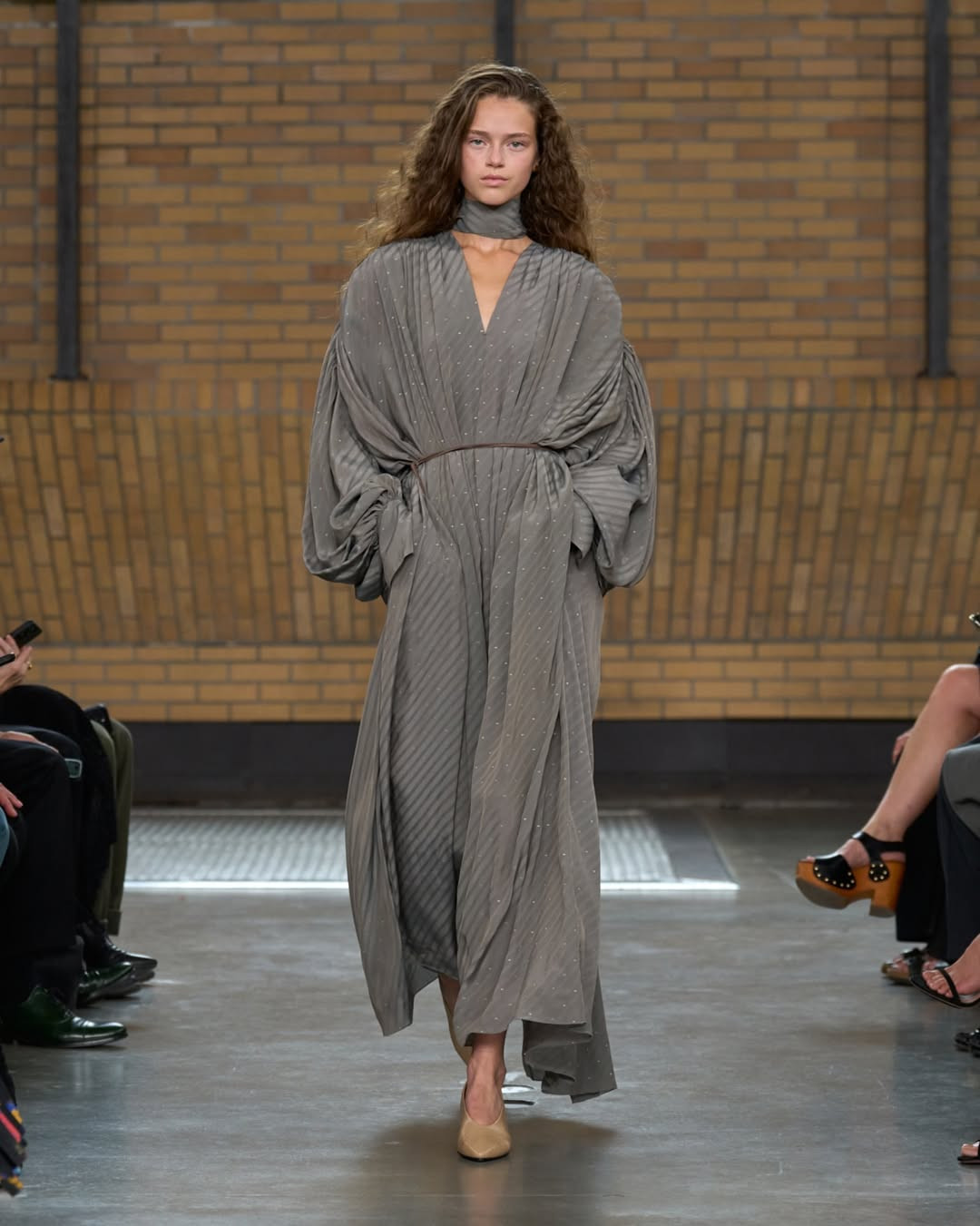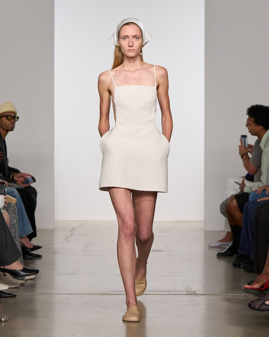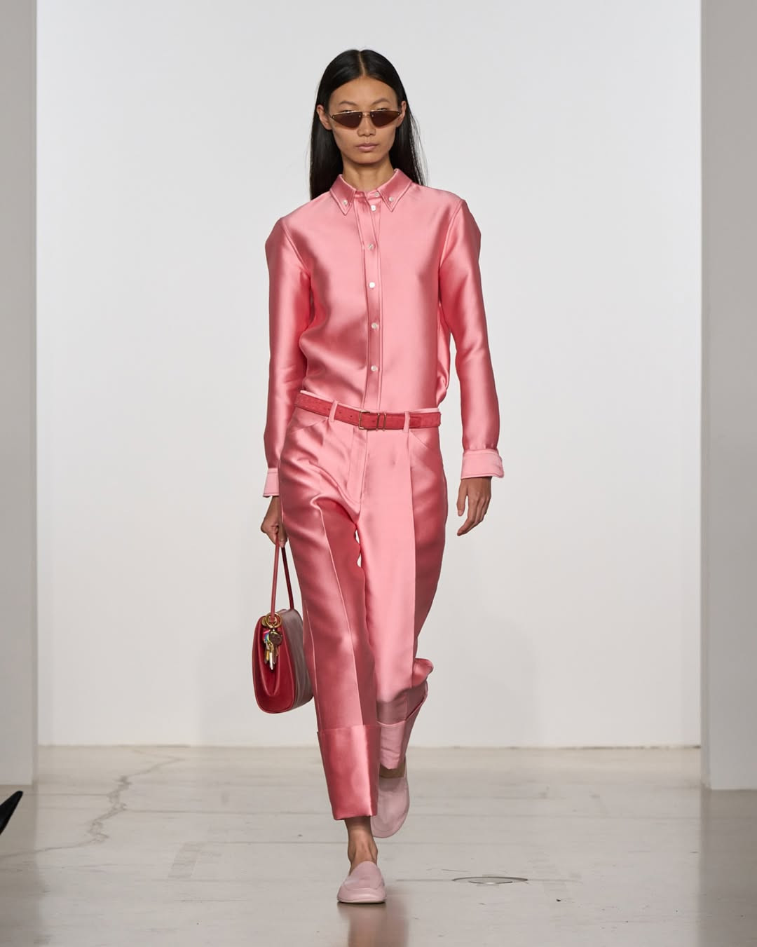Показ открылся строгими платьями-передниками из шелка и хлопка, но очень скоро на подиуме появились прозрачные бра, выглядывающие из-под пиджаков, шелковые драпировки с архивным принтом 1974 года, помпоны на жакетах и подвязках, массивные воротники-стойки, словно из культовых кадров «Клана Сопрано». Нельзя не отметить и то, как Леони добавила в коллекцию иронии и спорта, напоминая: жизнь в городе всегда многослойна. Одни модели демонстрировали леггинсы с культовой резинкой, а другие — спортивные очки.