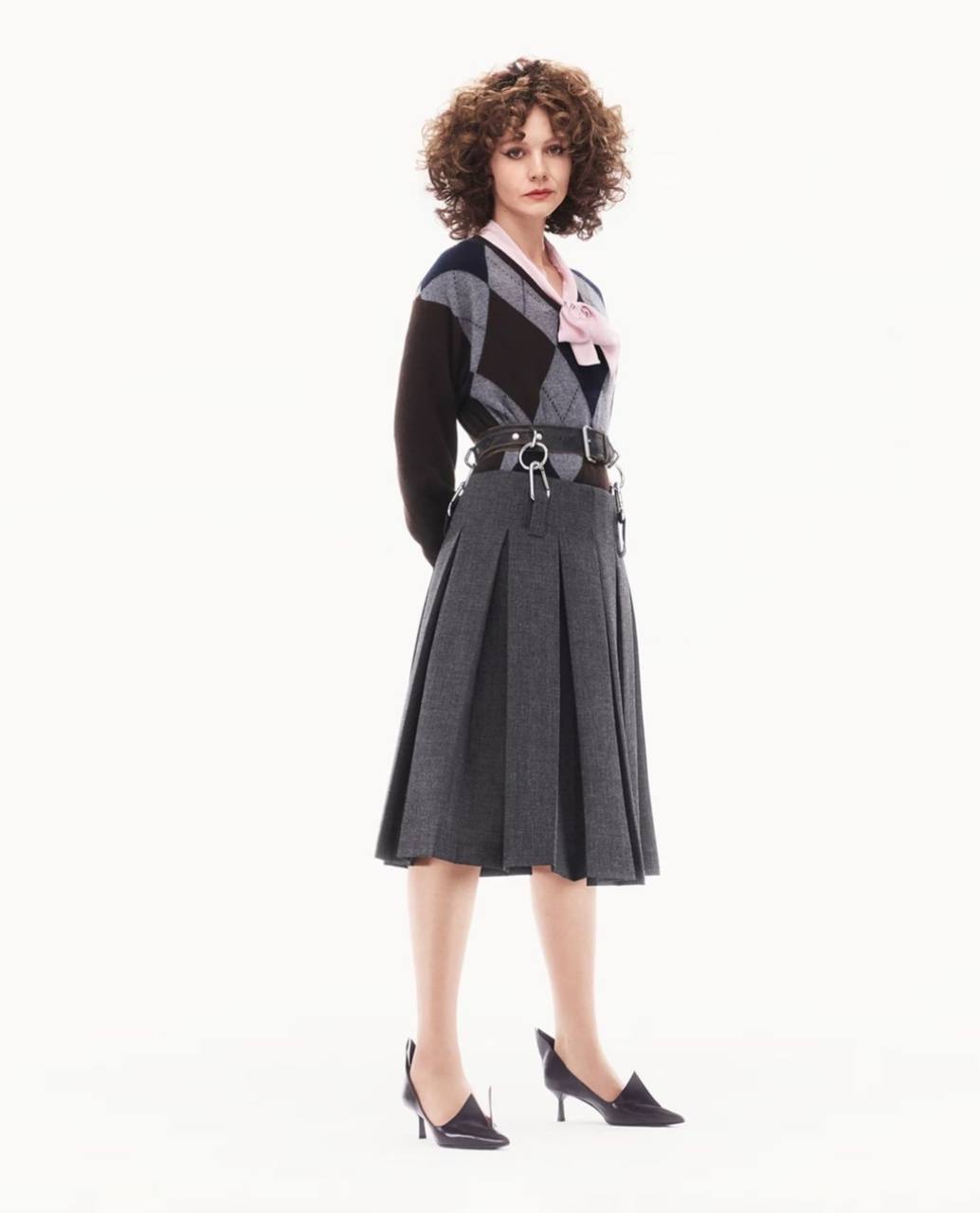 На Маллиган можно увидеть легкое платье с цветочным принтом, строгую плиссированную юбку в паре со свитером или розовую блузку, дополненную серыми брюками свободного кроя и эффектными ремнями trompe l’oeil. Каждый из этих образов словно создает нового персонажа, отражая философию Дома — идею множества граней внутри одного целого.