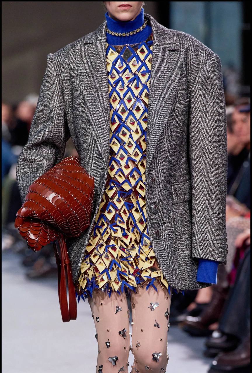 Наряду с этим в образах присутствовали и фирменные элементы Rabanne: металлические аксессуары, кристаллы на одежде и канцелярские кнопки, украшающие колготки.