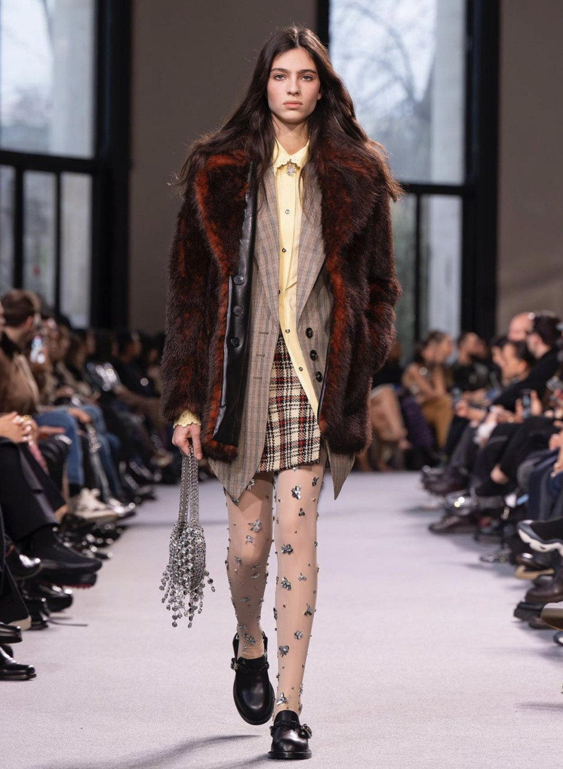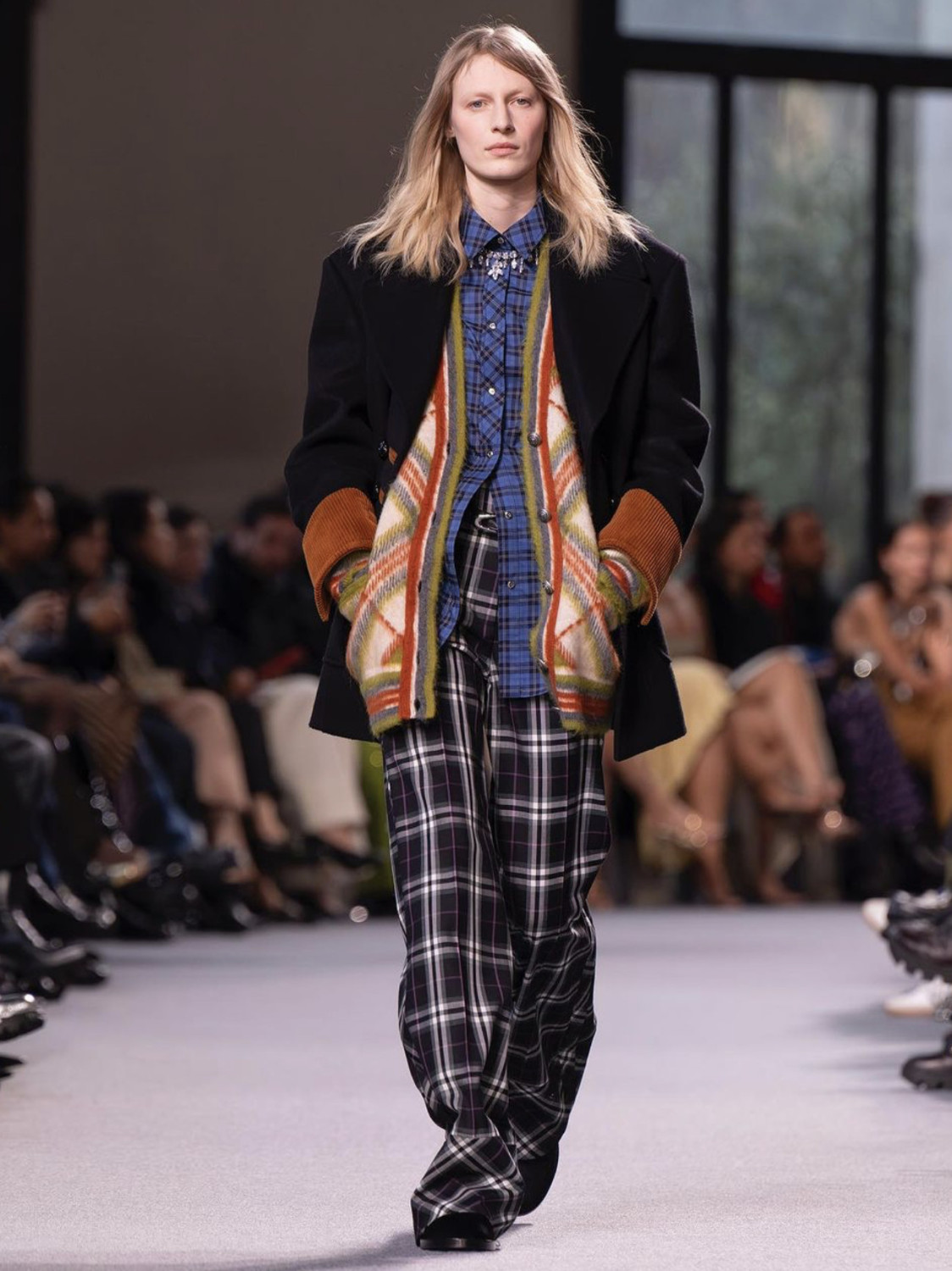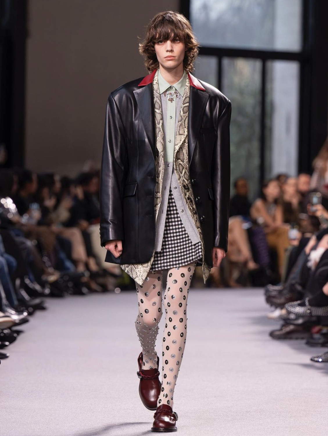 При создании линии AW '24 дизайнер отдал предпочтение эклектичным принтам, пэчворку, объемным плечам и «плюшевым» тканям. Максимализм во всех смыслах этого слова. От анималистичного свитера и клетчатых брюк до юбки с шипами и причудливых колготок — каждый предмет гардероба призывал к экспериментам и самовыражению, с помощью стилизации mix-and-match. Кожаные жакеты с шубами надевались поверх пиджаков и рубашек в клетку.