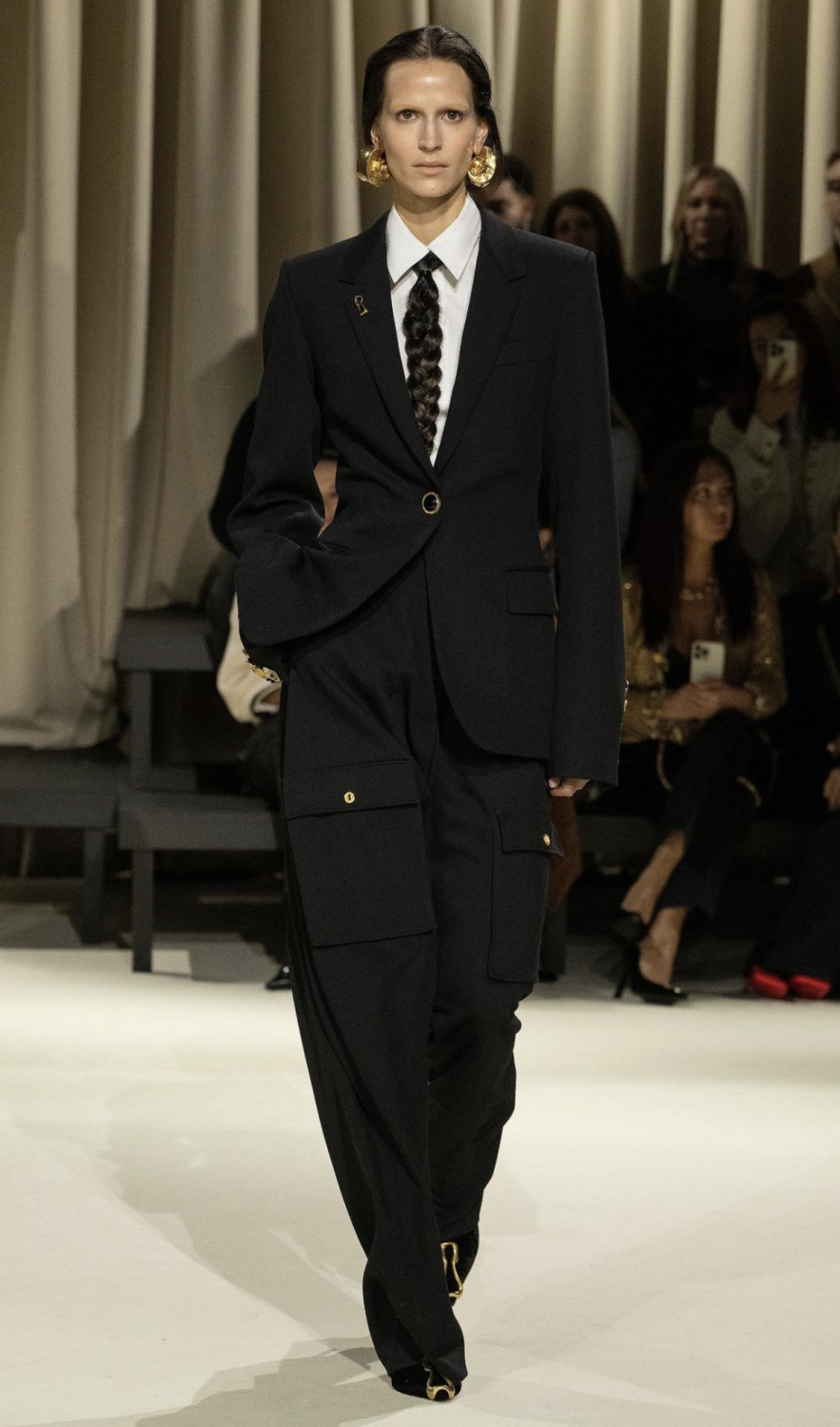 Показ открыла серия классических нарядов в минималистичной палитре. Первый костюм в мужском стиле был надет на голое тело и сочетался с сумкой, украшенной знаковым сюрреалистичным «лицом» бренда, а следующие — дополнены галстуком из искусственных волос, скрученных в косу. Такова реальность Розберри. Вся магия Schiaparelli раскрывалась в деталях. На шубе расположились пуговицы в виде сосков, а на лакированной куртке — мотив кубиков пресса.