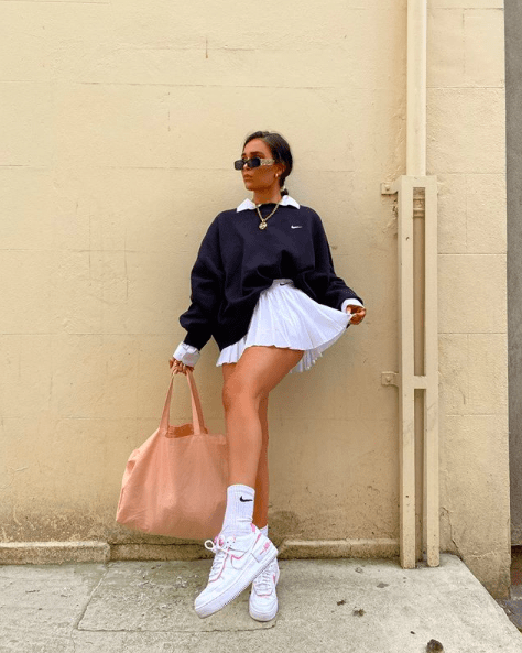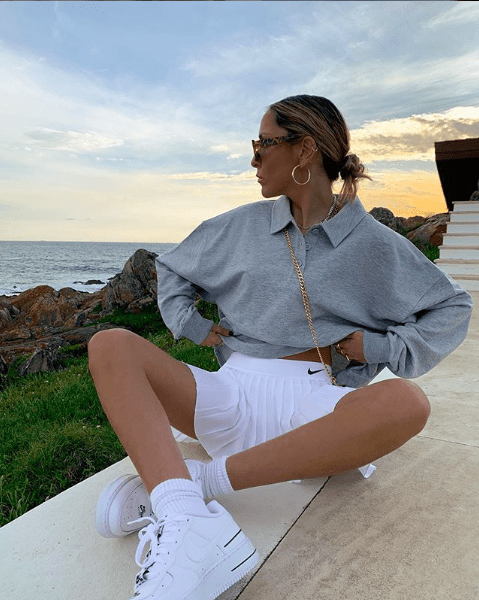 Главный фаворит – модель от Nike в белом цвете. Сочетаем с оверсайз свитшотами, объемными кроссовками и высокими носками. В сильную жару (самым смелым) можно комбинировать с сексуальными кроп-топами, а кроссовки заменить на сандалии или босоножки на танкетке. Обязательный элемент: бронзовый загар.