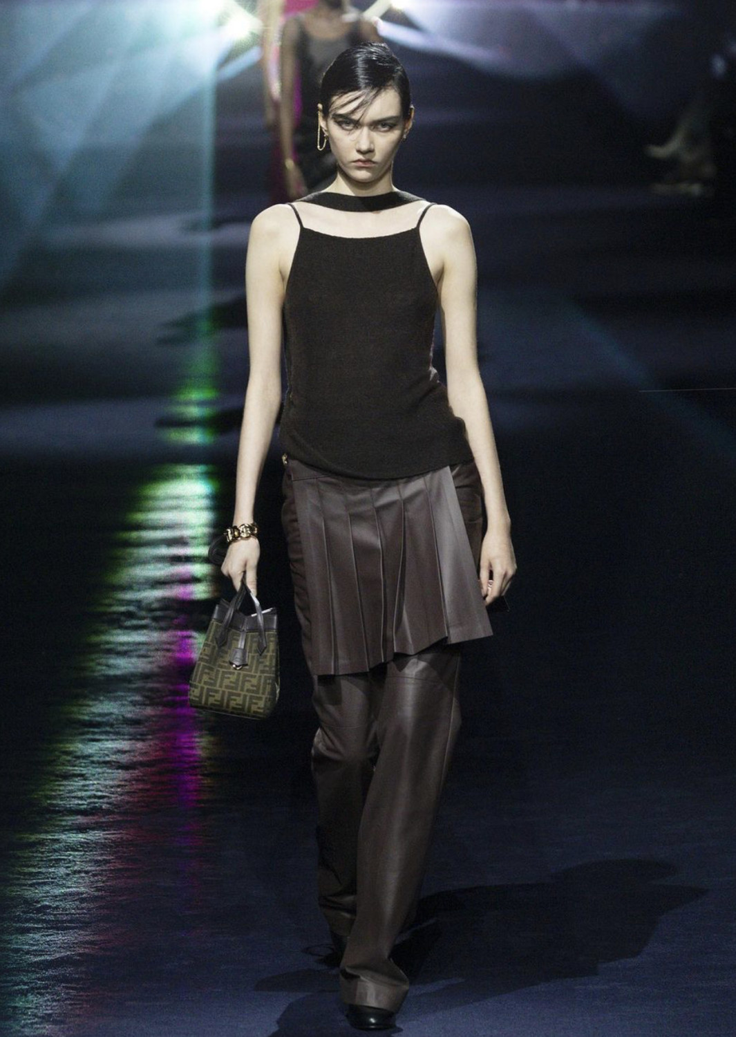 Chanel, Givenchy и Burberry — налицо факт того, что Skousers является ключевым трендом показов сезона AW '23. Наиболее привлекательные модели, по мнению нашей редакции, представил Ким Джонс в коллекции FW '23 Fendi. Всего было представлено 12 вариантов: от классических кожаных до атласных в розовом цвете. В интерпретации дизайнера поверх брюк были надеты плиссированные килты — именно благодаря этому был искусно соблюден баланс между маскулинностью и феминностью.