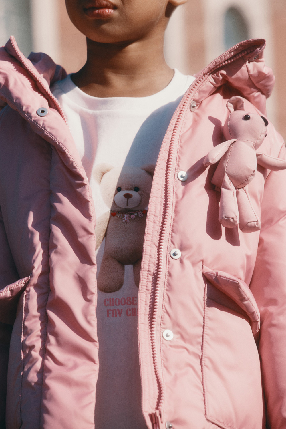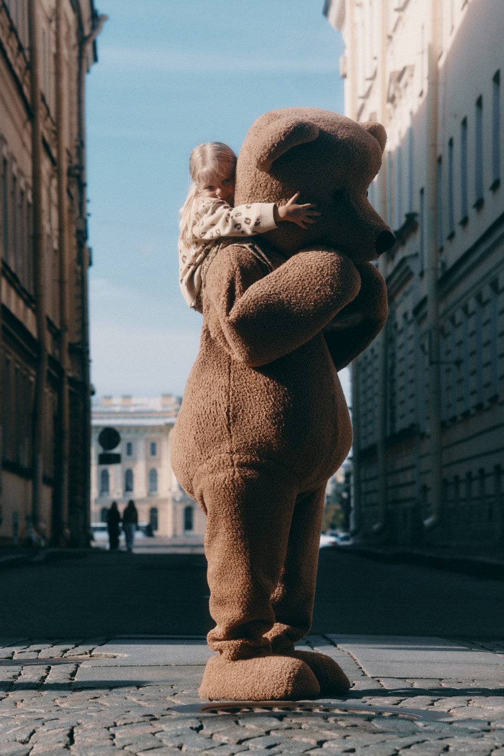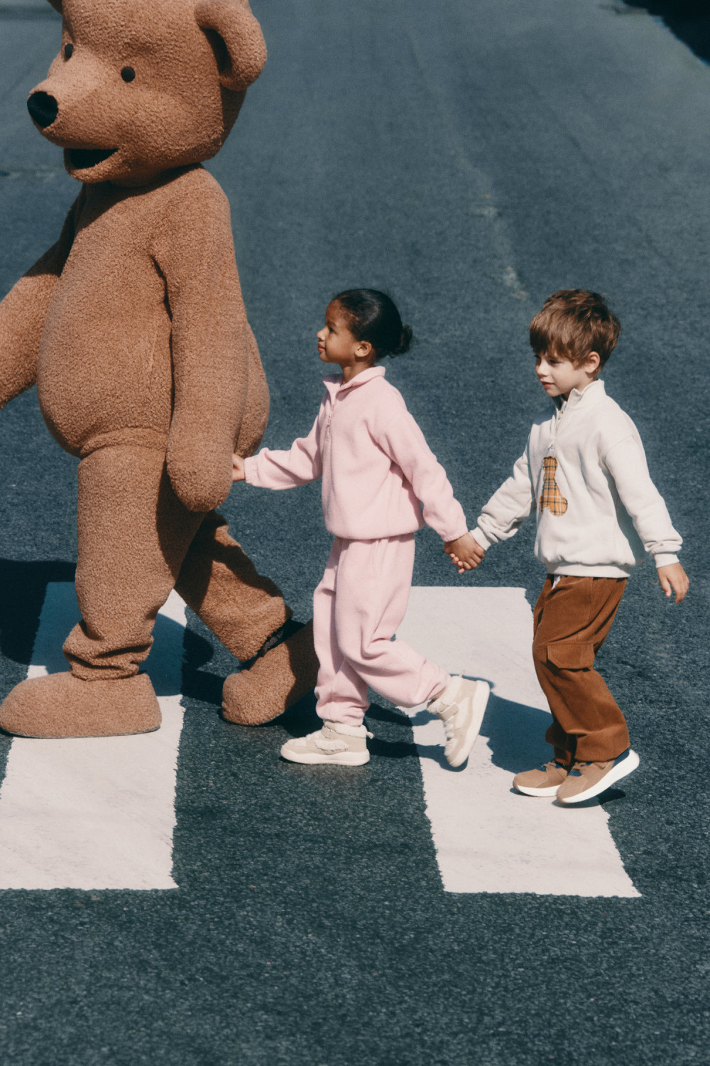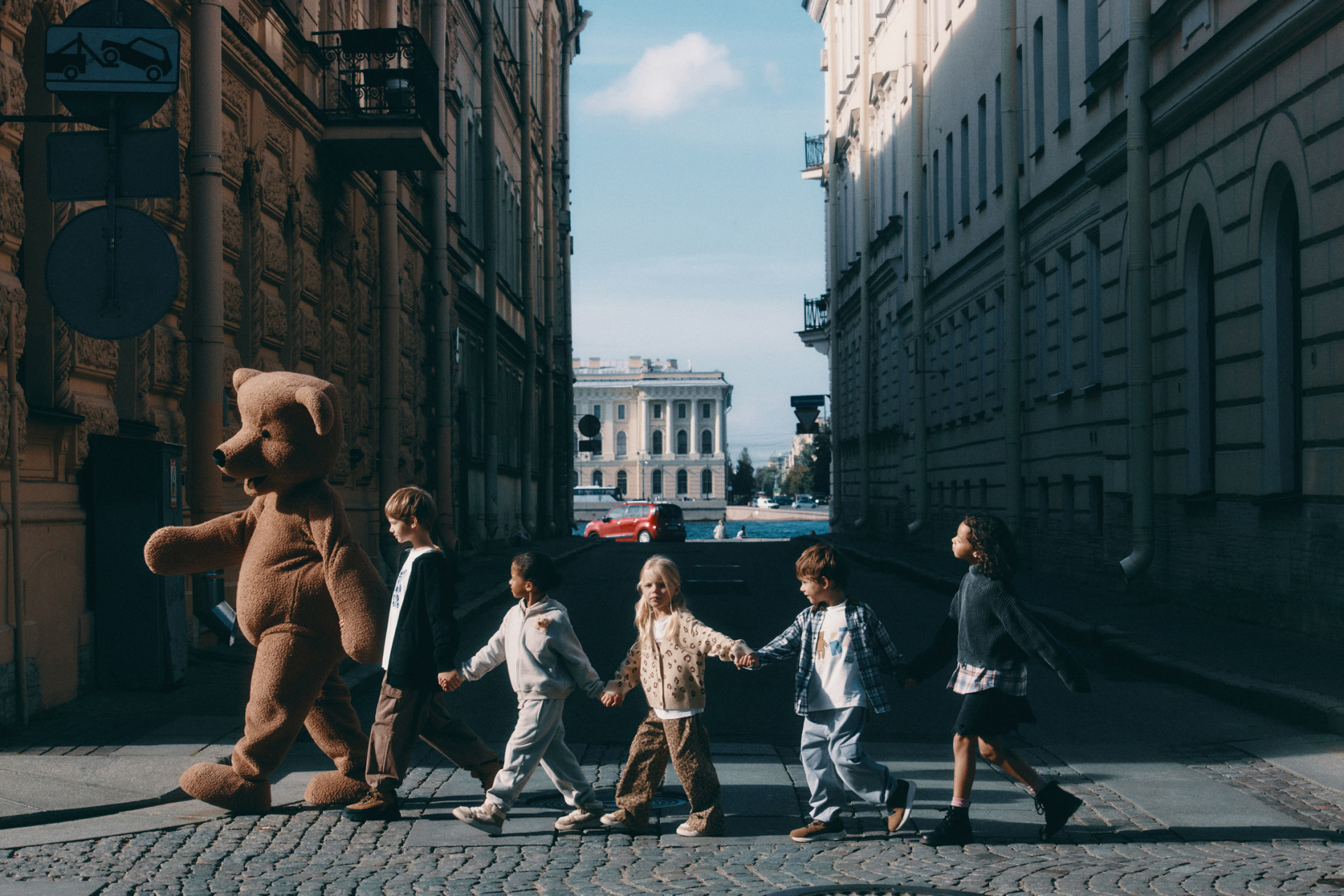 На страницах кампании дети отправляются в захватывающие городские прогулки вместе с их пушистым другом — большим медведем. Специально для этой съемки команда дизайнеров LIMÉ оживила мишку, украсив его принтами и аппликациями из новинок, создав ростовую игрушку.
