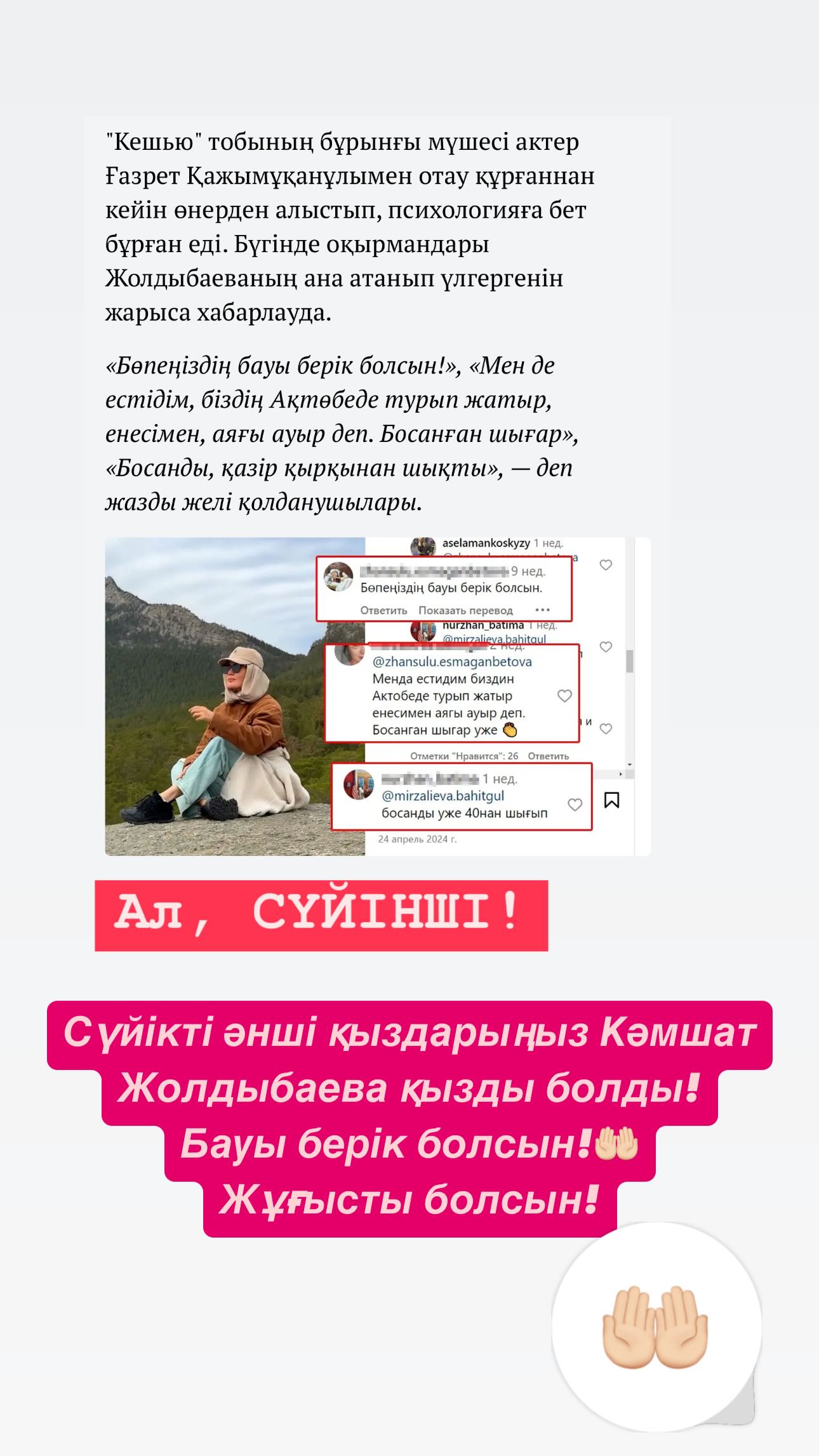 «Ал, сүйінші! Сүйікті әнші қыздарыңыз Кәмшат Жолдыбаева қызды болды. Бауы берік болсын! Жұғысты болсын!»,