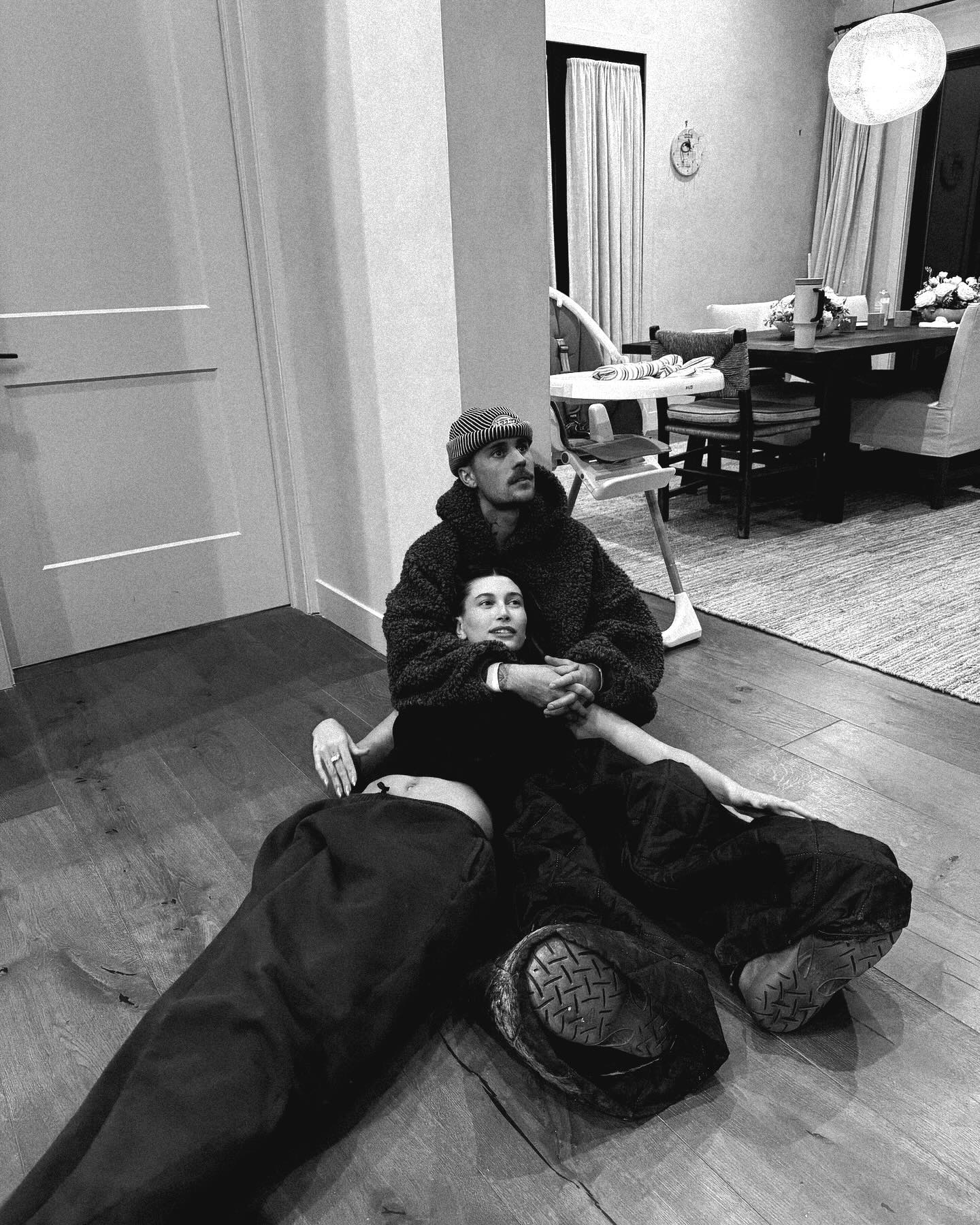 На одном снимке Джастин поет в микрофон, а Хeйли улыбается и обнимает его сзади. На другом кадре пара держит своего 6-месячного сына, на котором надеты неоново-зеленый комбинезон и шапочка. Также Бибер опубликовал архивные фотографии, на которых он еще совсем мал.