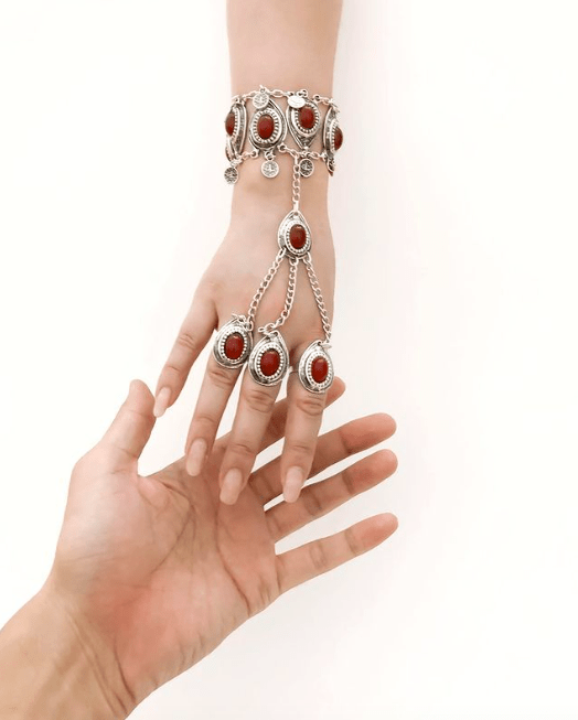 Сложная конструкция, состоящая из браслета, цепочек и колец. Раньше это украшение было частью традиционного наряда невесты или же носили на одной или двух руках как оберег, но эта тенденция уже устарела, сейчас же можно носить с любой одеждой на каждый день, аксессуар подходит даже к простым джинсам и футболке.