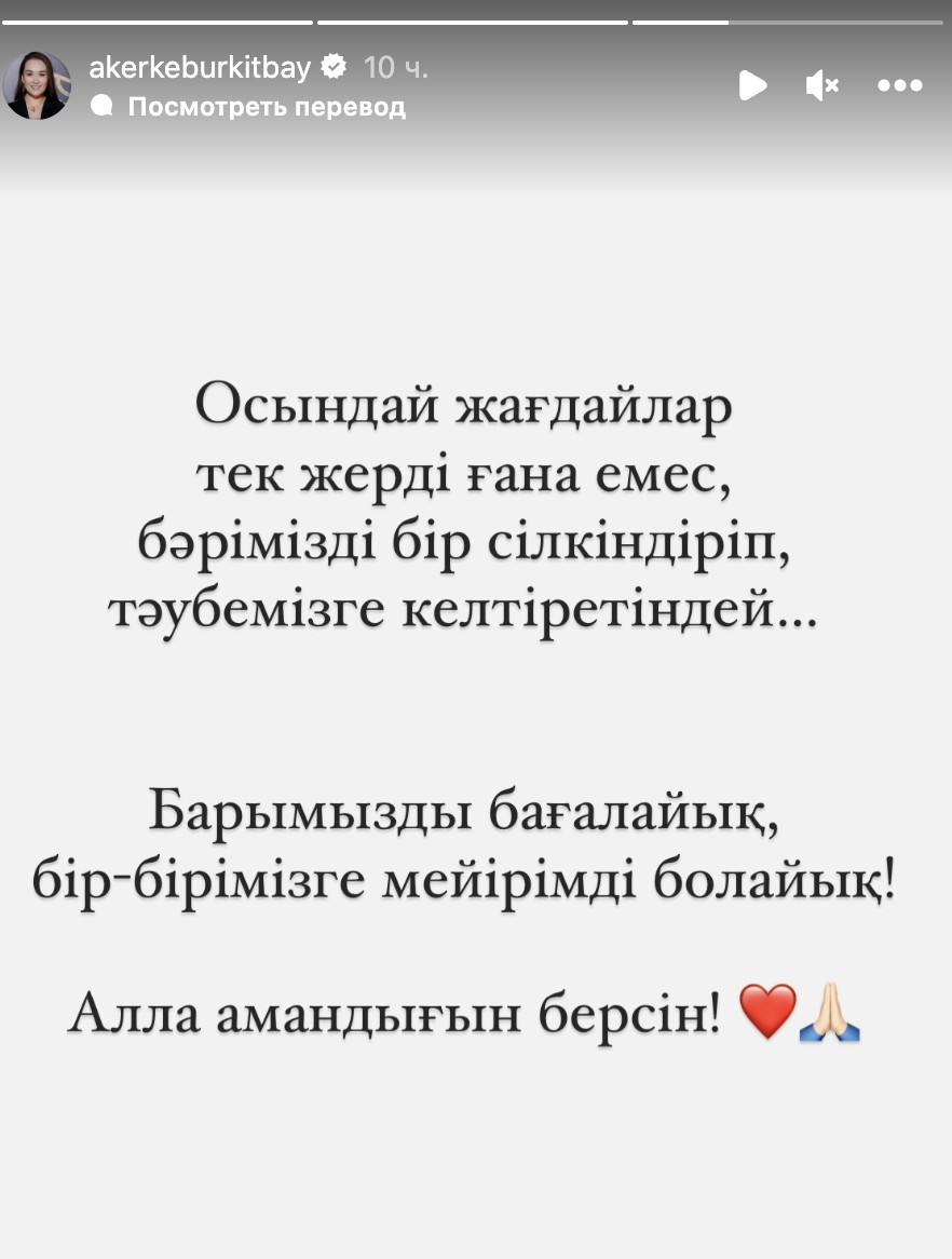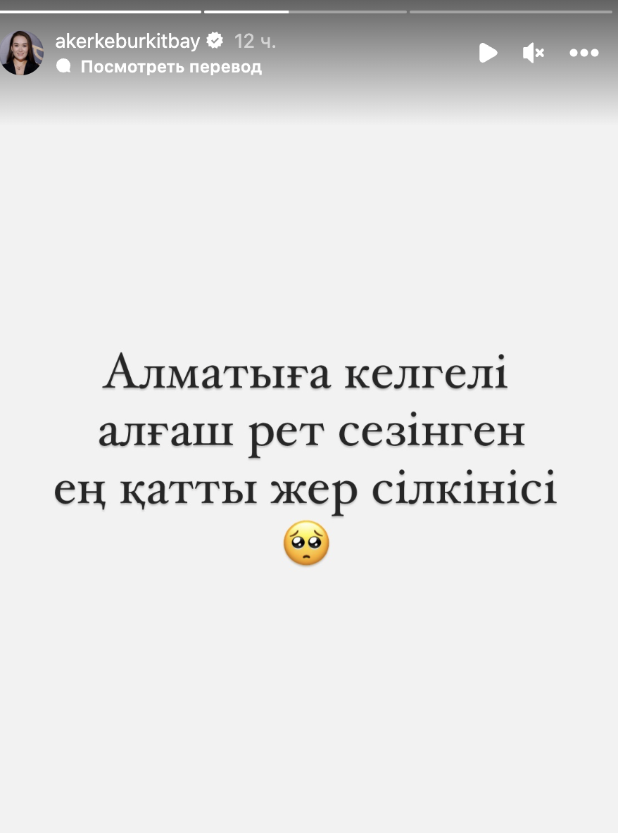 «Первое землетрясение такой силы, как я приехала в Алматы. Случившееся не только сотрясло землю, но и нас должно встряхнуть и привести в чувство. Давайте ценить друг друга и быть добрее. Пусть Аллах хранит нас всех».