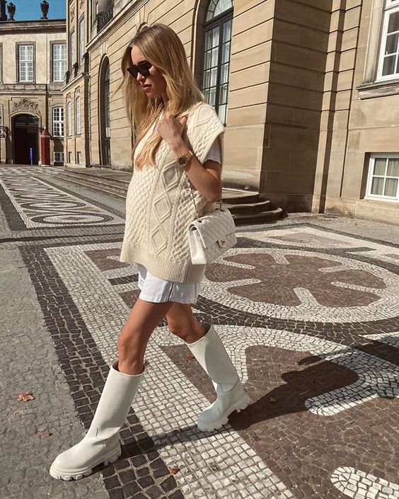 Уютно и тепло сочетается то же самое платье-рубашка с актуальным трикотажным жилетом и сапогами с массивной подошвой.