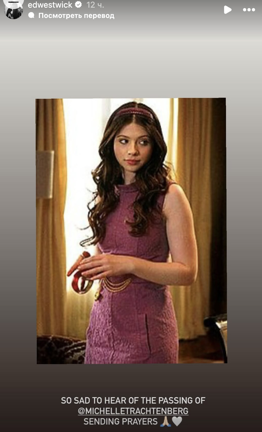 «Так грустно слышать о кончине @michelletrachtenberg. Посылаю молитвы».