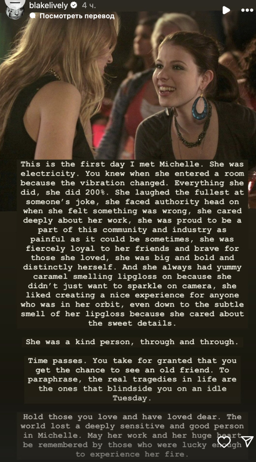 Блейк Лайвли оплакивала потерю своей коллеги по «Сплетнице» Мишель Трахтенберг, опубликовав совместную фотографию с актрисой.