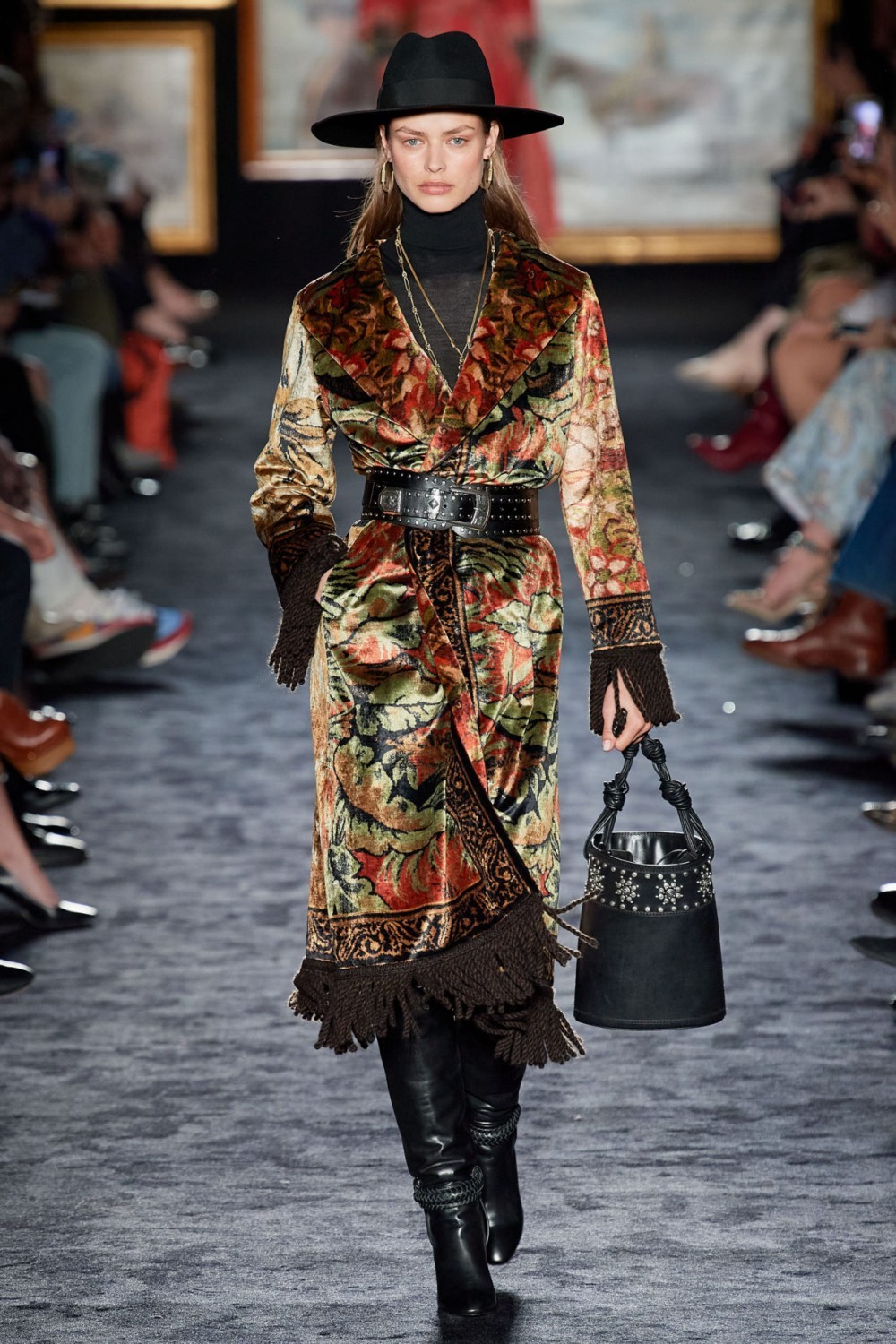 Ткани «ковров и гобеленов» были представленны на многих показах. Тяжестью своих принтов, они создавали визуально теплые образы. Вдохновиться и приобрести себе что-то на осень можно в магазинах Etro и Nicole Miller.