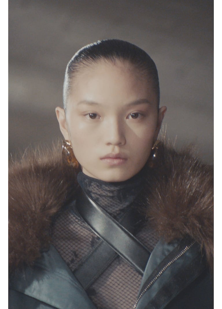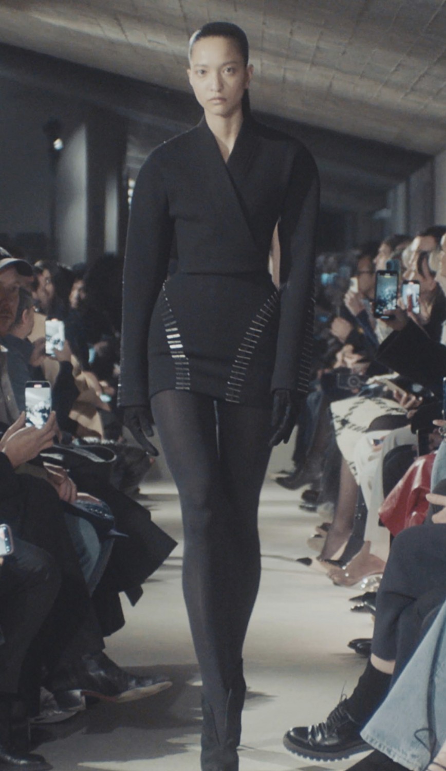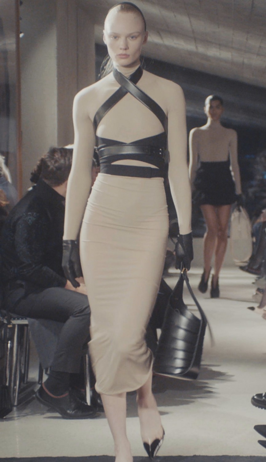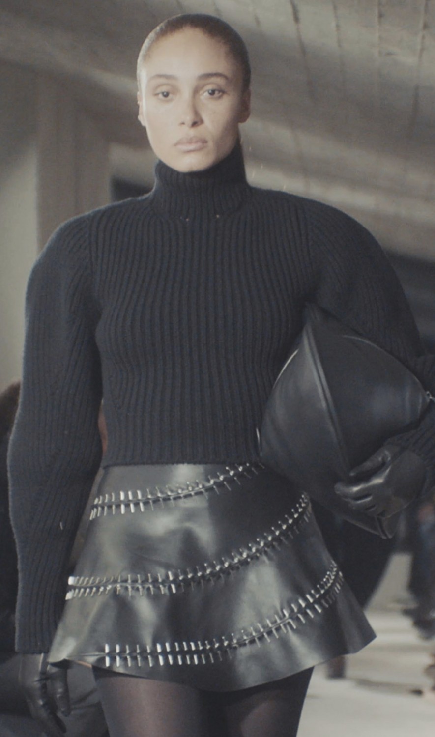 Коллекция лето-осень 2023 года — это исследование Alaïa — его анатомии, психологии и души. Дизайнер использовал фасоны, силуэты и любимые материалы Аззедина — кожу, трикотаж, но не прибегал к буквальному цитированию. «Я не хотел холодного, безэмоционального гламура. Я хотел сделать что-то очень интимное, камерное, в стиле Аззедина», — сказал Мюлье. И ему это удалось. Он изысканно заигрывал с наследием бренда и продемонстрировал свою интерпретацию прошлого. На подиуме были не только привычные нам облегающие образы, но и невероятная игра с объемами. Облегающие водолазки и пышные юбки, оверсайз-пуховики и отсутствие брюк — силуэты, построенные на контрасте, стали лейтмотивом коллекции. Швы кожаной юбки, платье из «обнажающей» тюли и рукава жакета были усеяны серебряными «скрепками» — сам Алайя не раз прибегал к данному методу декорации.
