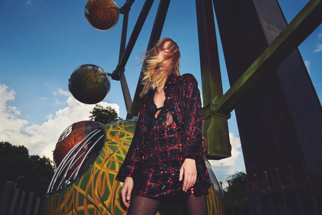 Дерзкие, с буйством пайеток и необычными деталями - все это об изделиях бренда. Лекси идеально демонстрирует оригинальный дух коллекции между катанием на карусели и подъемом по живописному маршруту.