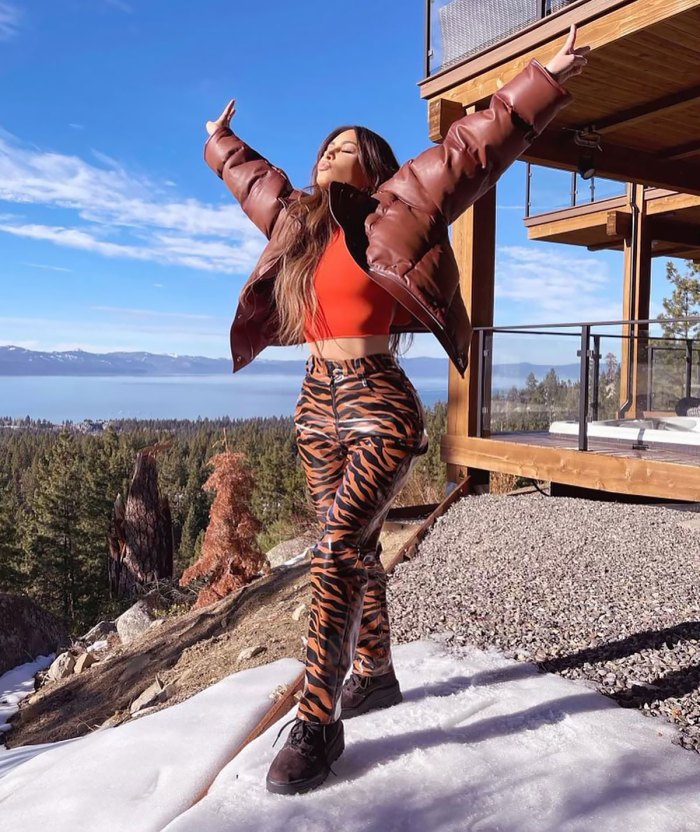 Ким не была бы собой, если бы не надела брюки с тигровым принтом. К ним она подобрала куртку в тон и яркий красный топ.