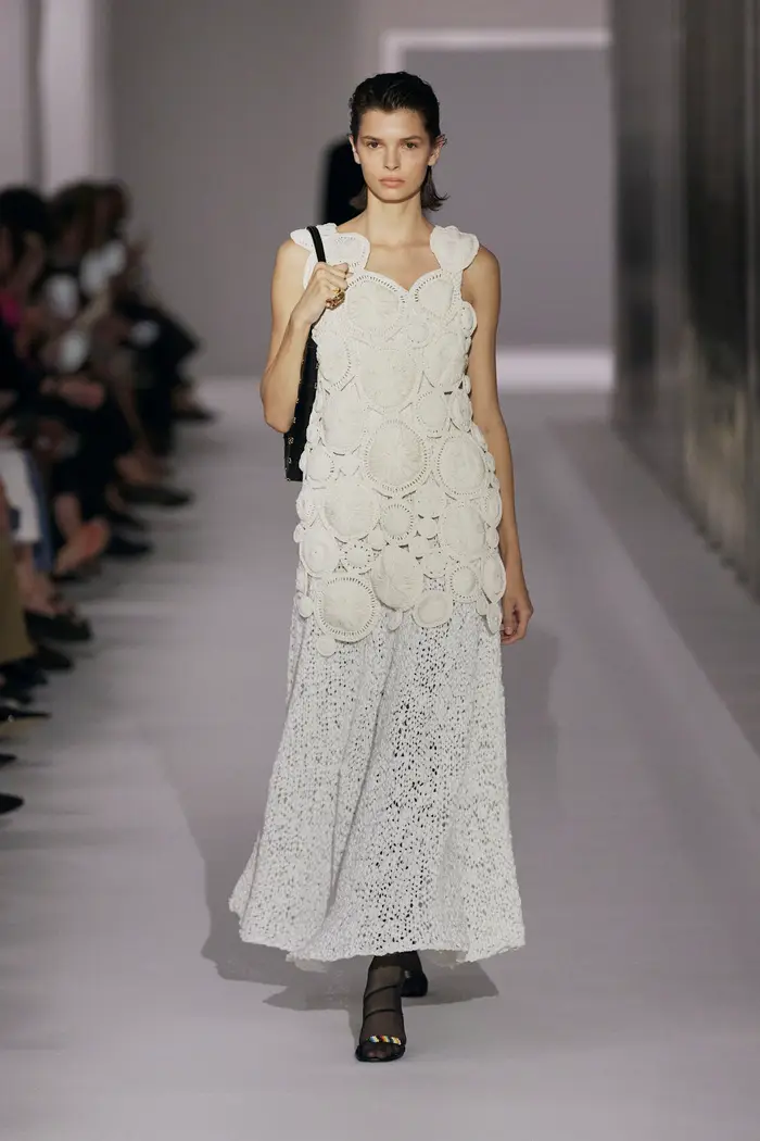В этом сезоне Холстейн также обратила внимание на ручную работу. Юбка из черного вязаного кружева, сочетающаяся с объемным свитером, продемонстрировала ее стремление исследовать текстуры и ремесленные техники. Коллекция также включала графические кроше-туники и игривые детали в виде помпонов.