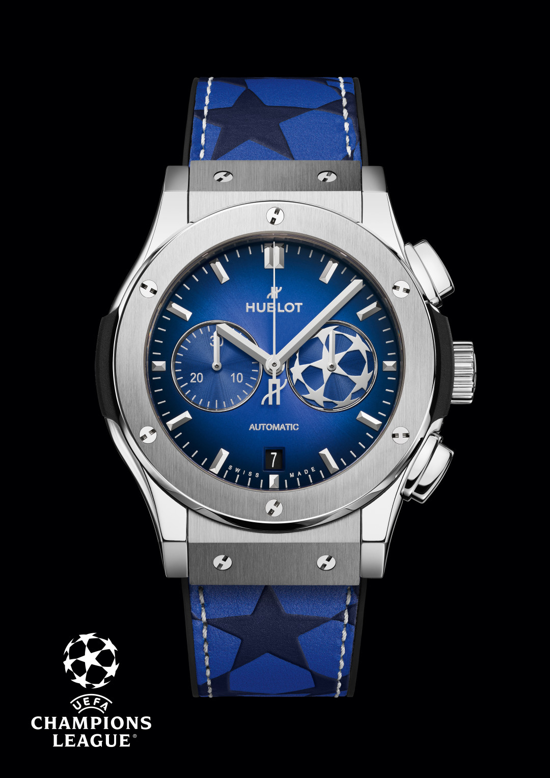 Модель Classic Fusion Chronograph UEFA Champions League Titanium выполнена в 42-миллиметровом корпусе из сатинированного и полированного титана. Ее циферблат сияет градиентным синим, отсылающим к фирменному цвету турнира, а на счетчике в позиции «3 часа» красуется официальный логотип Лиги. Ремешок сочетает черный каучук и синюю телячью кожу с тиснением в виде звездного мяча — символа чемпионата.