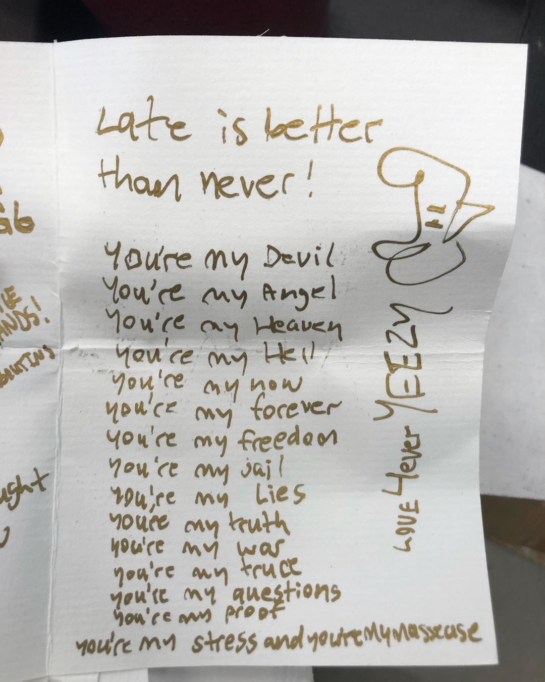 В поздравительном письме Канье нарисовал себя и Ким. Милую картинку сопровождали трогательные строки: "Лучше поздно, чем никогда. Ты мой дьявол и мой ангел, ты мой рай и мой ад, ты мое мгновение и моя вечность, ты моя свобода и моя тюрьма, ты мой обман и моя правда, ты мой вопрос и мой ответ, ты моя война и мое перемирие, ты моя тревога и мое спокойствие".