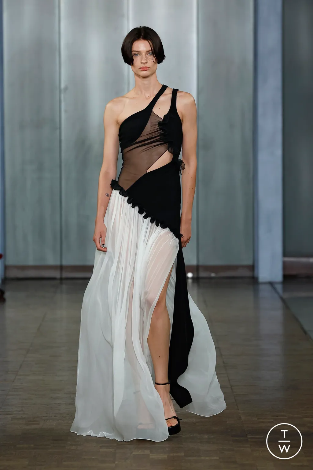 Ее коллекция для весны представила множество узнаваемых элементов, таких как многослойный тюль, микро-драпировки и архитектурные детали в виде тончайших бретелей и миниатюрных застежек. Оранжевые цветы привнесли нежности корсету розового и сливового платья, которое завершило показ, в то время как бордовые цветы эффектно расположились на облегающем черном.