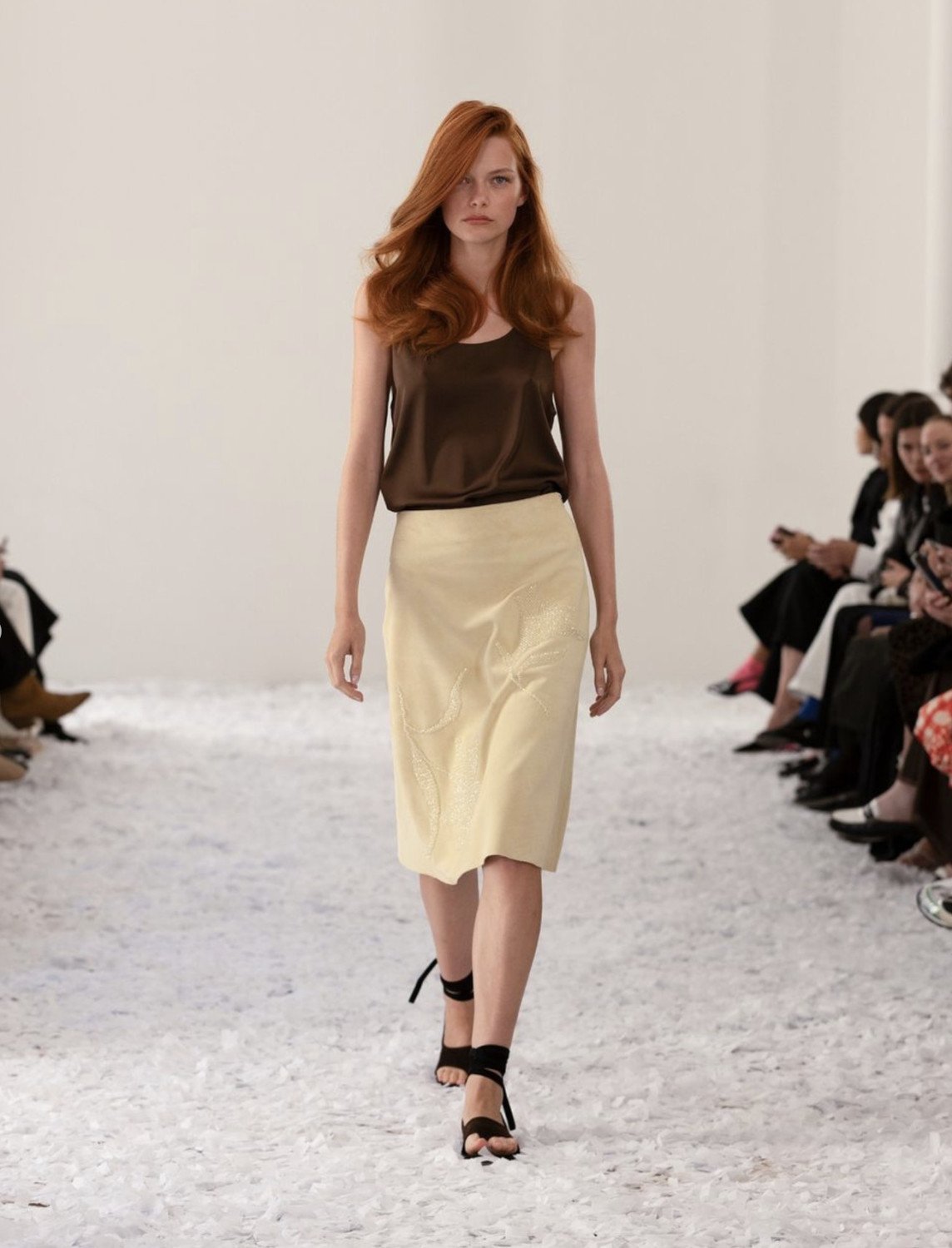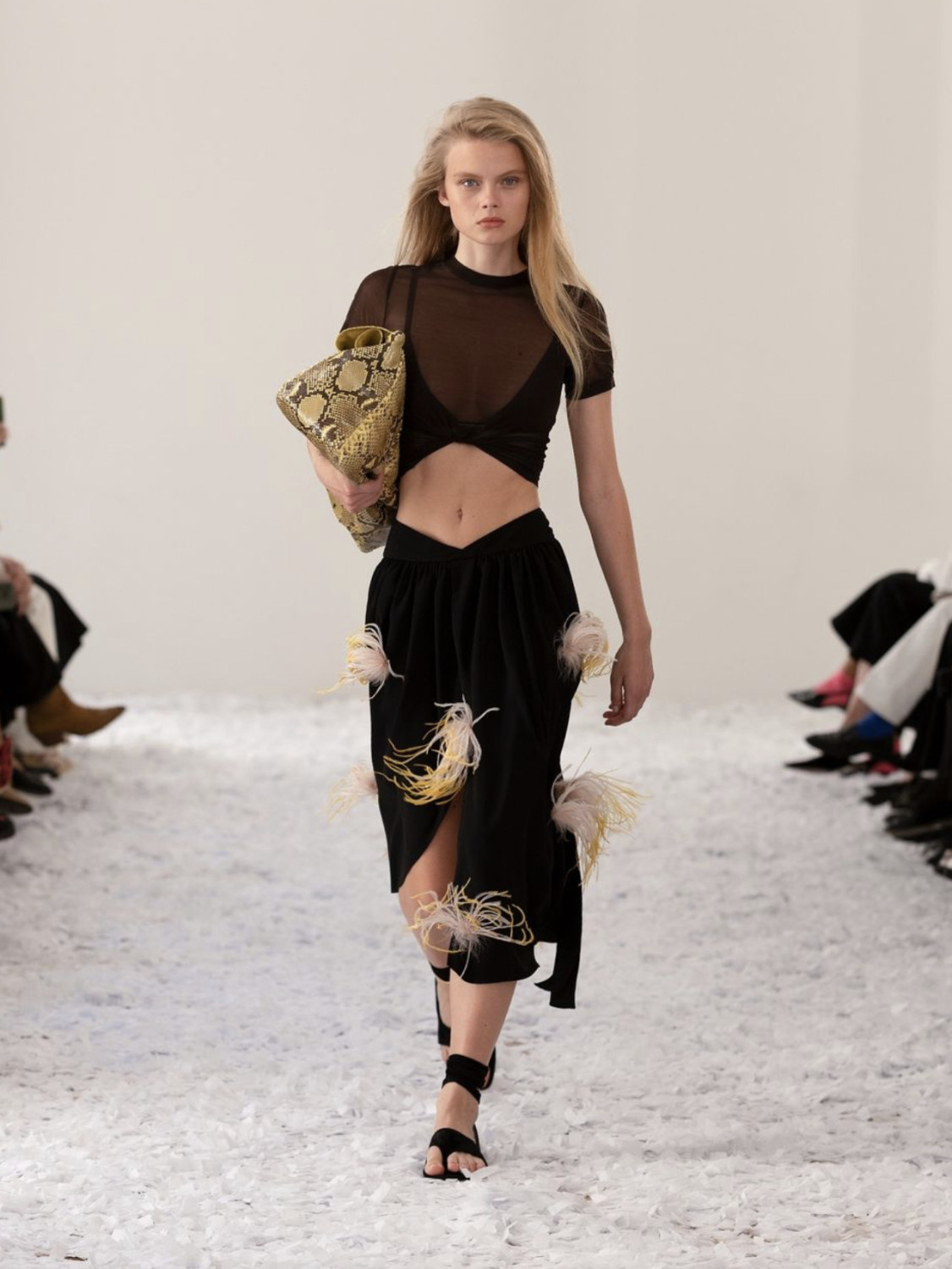 Шоу проходило в Королевской Академии Лондона, где аромат мимозы и цветов, создаваемый Diptyque, наполнил пространство, а пол по мере дефиле покрывался биоконфетти. Показ начался с легкий тренчей, юбок-карандашей и платья с контрастными воротниками, которые были окрашены в яркие оттенки желтого. Бра с металлическими деталями скрывались под кожаными мото-костюмами, а замшевые брюки сочетались с красными сумками из змеиной кожи. Стоит отметить, то, как Капальдо удалось привнести чувственности в коллекцию, комбинируя меховые шубы с мини-шортами,, а также украшая вечерние платья перьями и бисером.
