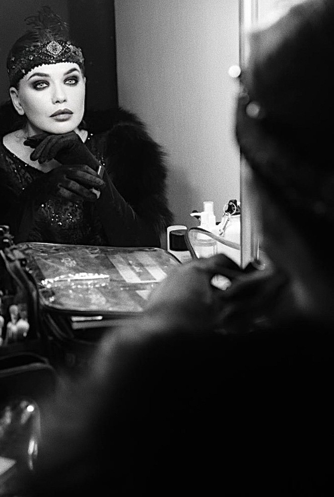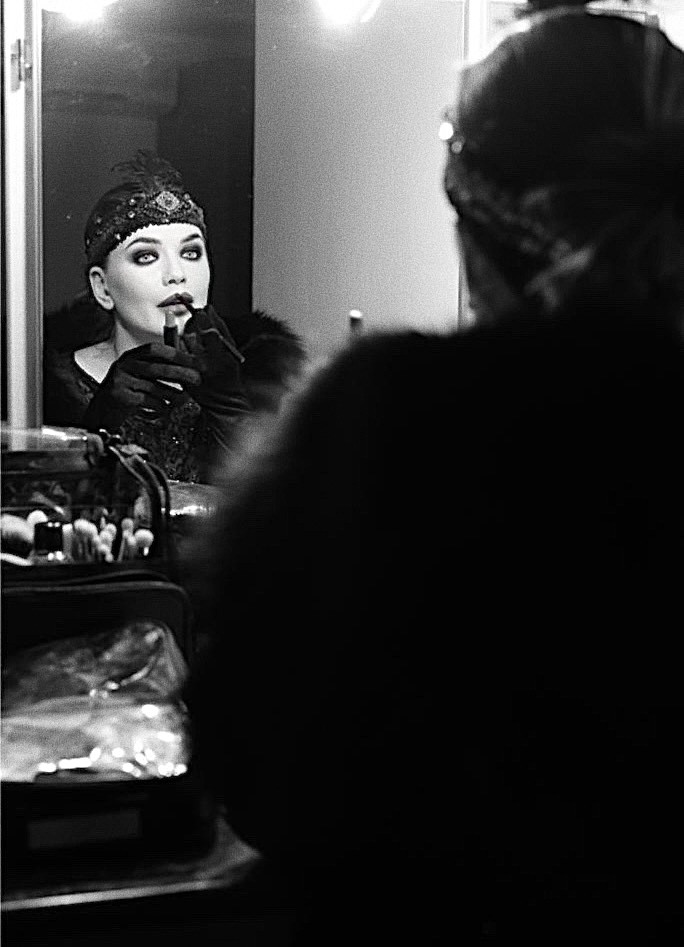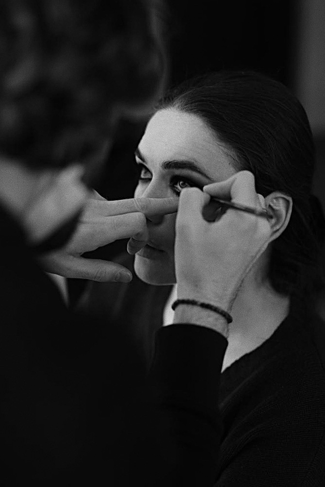 Макияж всегда начинается с выравнивания тона на лице, безупречно матовый и плотный, это делается для того, чтобы никто из посетителей театра не смог заметить бликов и мокрого лица актеров на сцене.