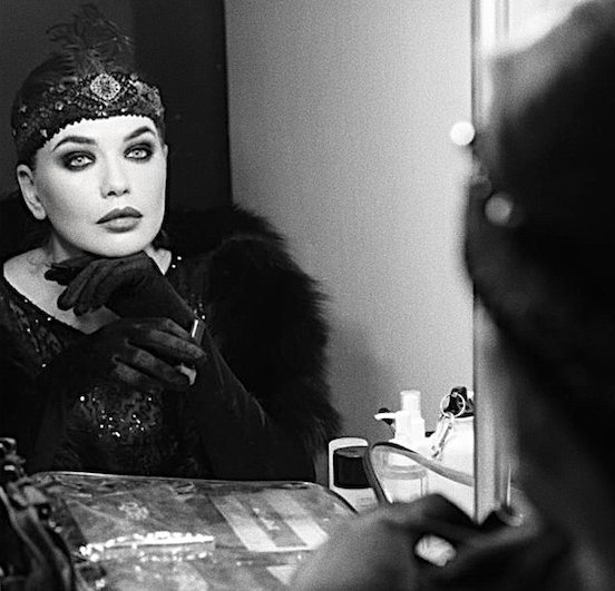 В основном в макияже для глаз отдается предпочтение классическому смоки. Можно подчеркнуть глаза тенями холодных оттенков и широкими черными стрелками. Тени черных , кирпичных и серых оттенков наносятся не только на подвижное веко, но и на область под бровью. Такой трюк позволяет визуально увеличивать глаза и делать взгляд более выразительным на сцене. На ресницы наносится обильное количество туши, после клеили накладные ресницы, которые придавали большой объем и драматичности взгляду.