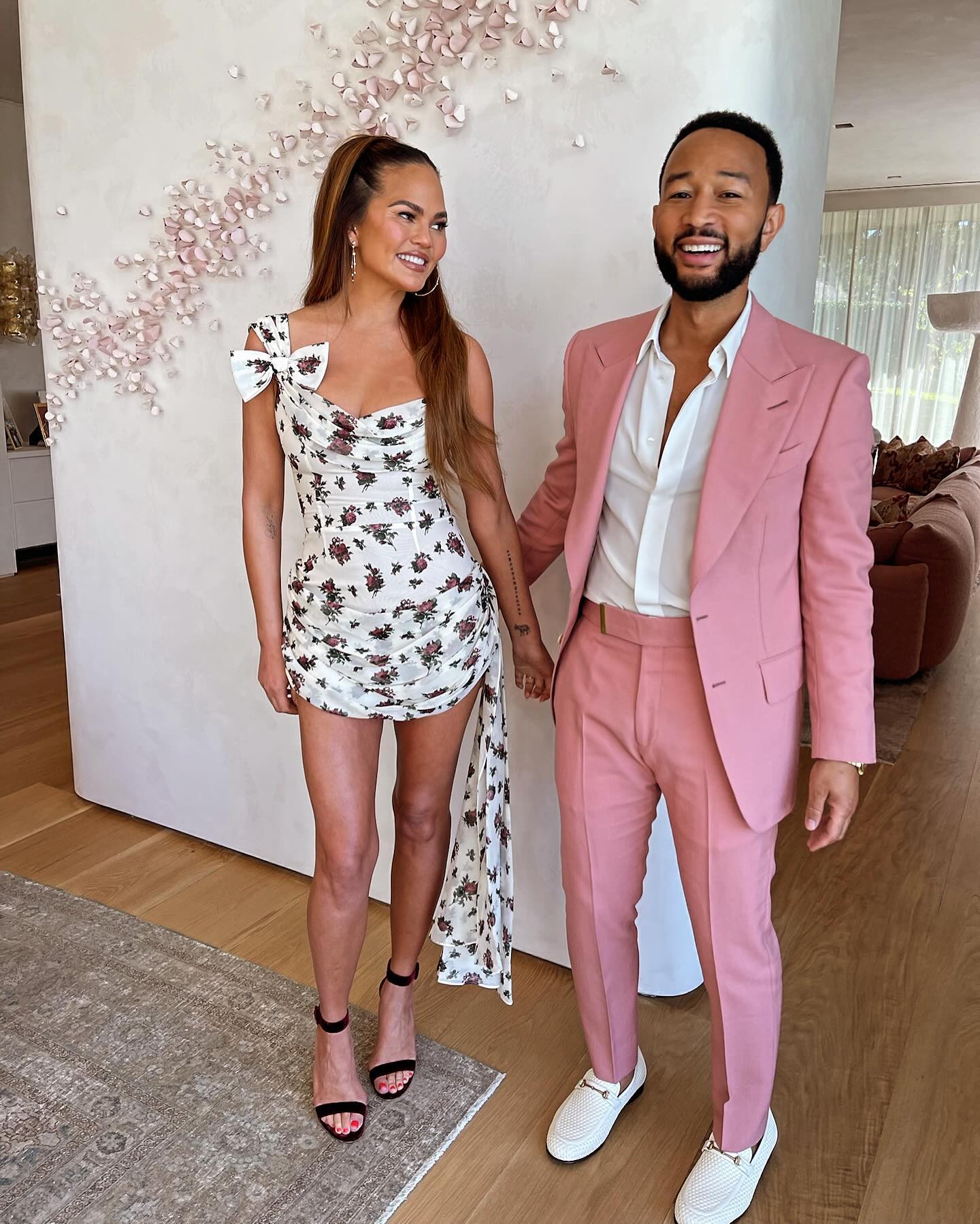 На снимках, сделанных в одном из клубов Нью-Йорка, видно, как Тейген идет к Ледженду в наряде из двух частей с бахромой и головном уборе из перьев. Певец выглядел взволнованным, когда его усадили на стул, а Крисси ловко опустилась перед ним на колени.